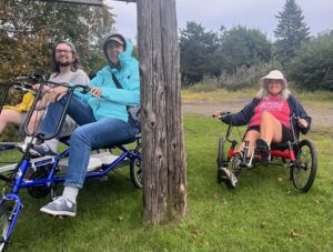 Image description begins. Three adult adaptive cycle riders smile and pose for a picture before a wooden post. Image description ends.