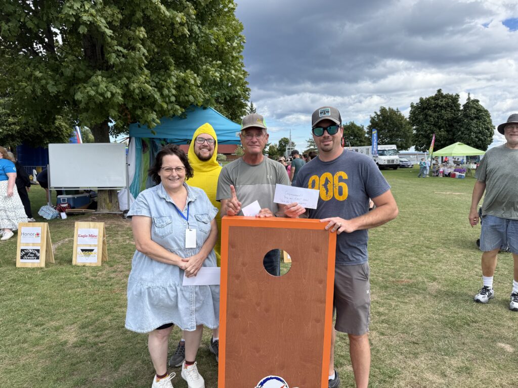 Image description begins. In an outdoor grassy area on a sunny day, SAIL consumers gather on both ends of cornhole boards to play cornhole. Image description ends.