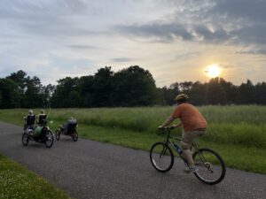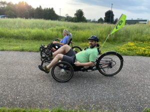 Image description begins. A man in a green shirt and a woman in a blue shirt are riding recumbent tricycles on a paved path in a green grassy area in the sunset. Image description ends.