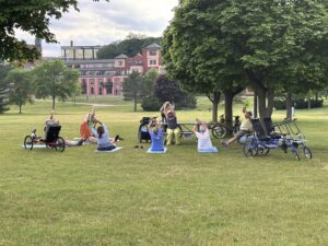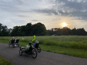 Image description begins. Five adults ride an array of cycles and adaptive cycles in the sunset in a grassy field. Image description ends.