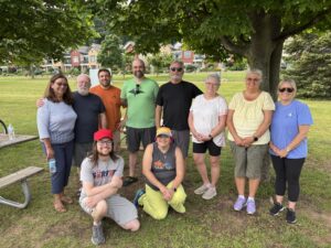 Image description begins. A group of adults poses for a picture under trees in a green, grassy park. Image description ends.