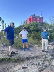 Image description begins. Three men are standing on a stony cliff in front of a red lighthouse. Two of them are wearing helmets. Image description ends.