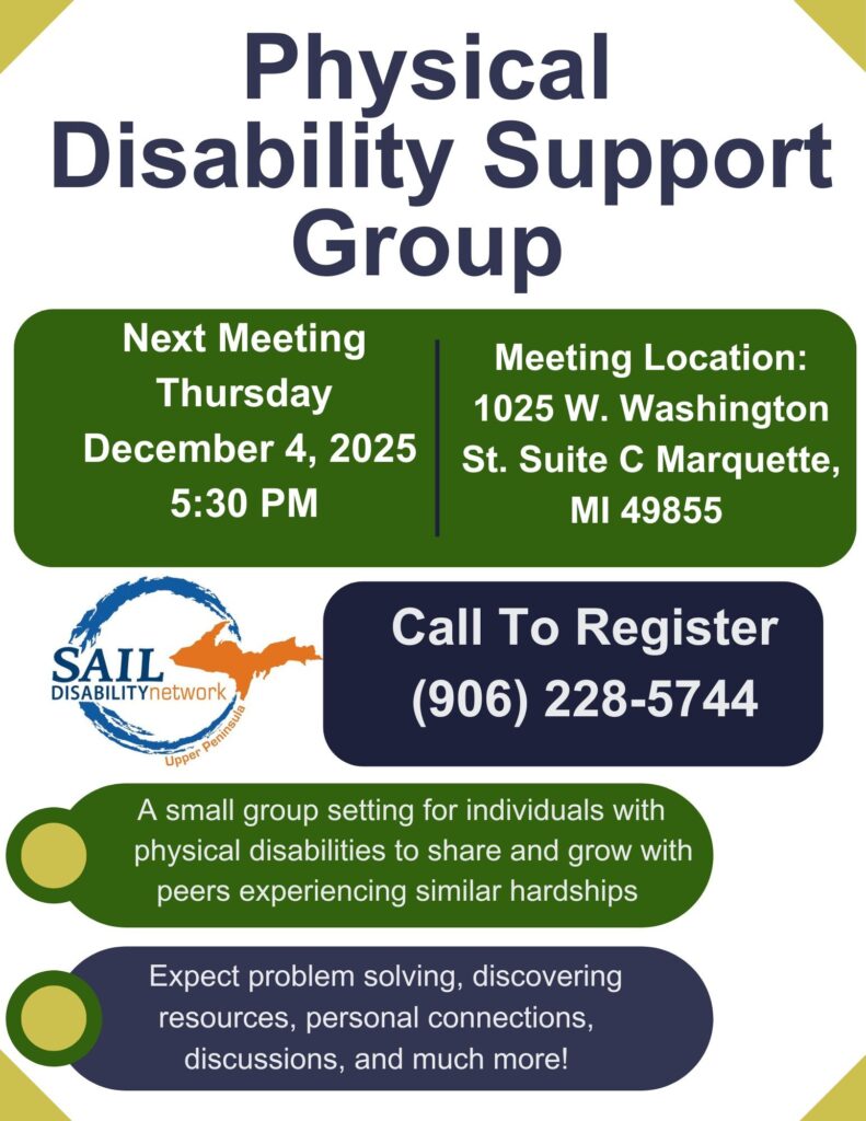 Image description begins. The flyer has a white background with green and blue accent colors. The flyer reads. Physical Disability Support Group. The next meeting will be held on Thursday, December 4, 2025, at the SAIL office, 1025 West Washington St, Marquette, MI at 5:30 P.M. Call 906-228-5744 to register. This is a small group setting for individuals with physical disabilities to share and grow with peers experiencing similar hardships. Expect problem solving, discovering resources, personal connections, discussions, and much more.” The SAIL Disability Network of the U.P. logo is in the middle of the page. Image description ends.