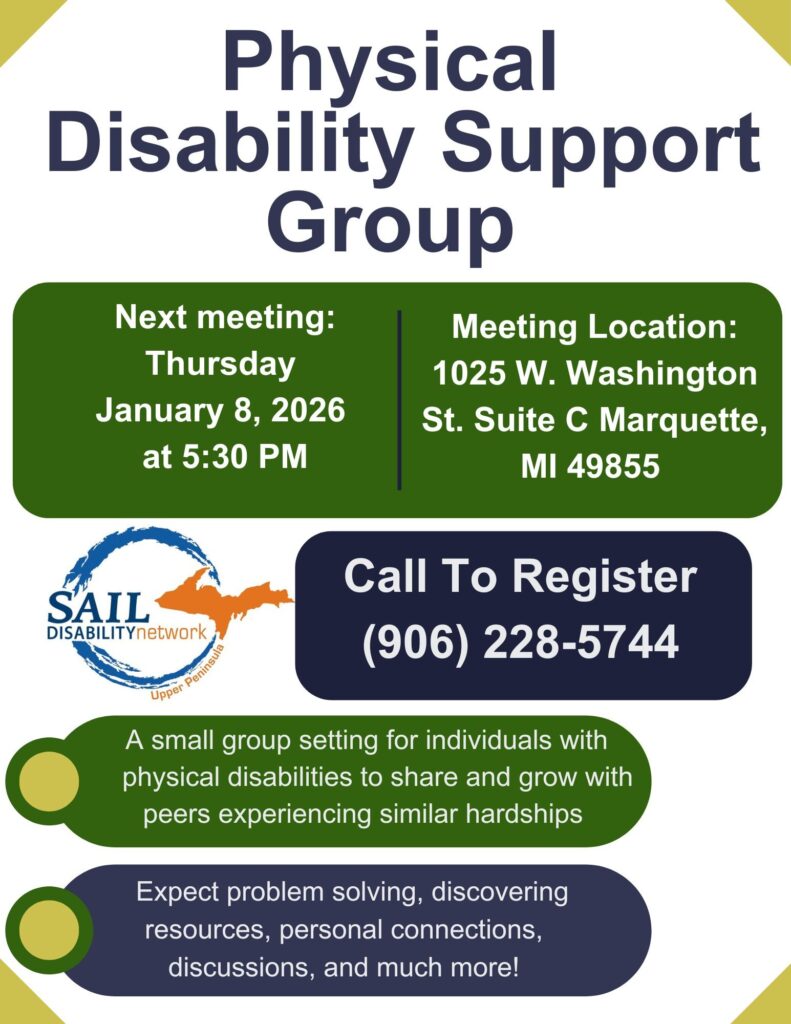 Image description begins. The flyer has a white background with green and blue accent colors. The flyer reads. Physical Disability Support Group. The next meeting will be held on Thursday, January 8, 2026, at the SAIL office, 1025 West Washington St, Marquette, MI at 5:30 P.M. Call 906-228-5744 to register. This is a small group setting for individuals with physical disabilities to share and grow with peers experiencing similar hardships. Expect problem solving, discovering resources, personal connections, discussions, and much more.” The SAIL Disability Network of the U.P. logo is in the middle of the page. Image description ends.