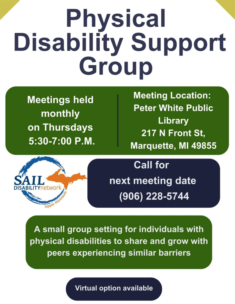 Image description begins. The flyer has a white background with green and blue accent colors. The text on the flyer reads Physical Disability Support Group. Meetings held monthly at the Peter White Public Library, located at 217 N. Front St., in Marquette, from 5:30 P.M. to 7 P.M. Call 906-228-5744 to register. This is a small group setting for individuals with physical disabilities to share and grow with peers experiencing similar barriers. Virtual option available. The SAIL Disability Network of the U.P. logo is in the middle of the page. Image description ends.