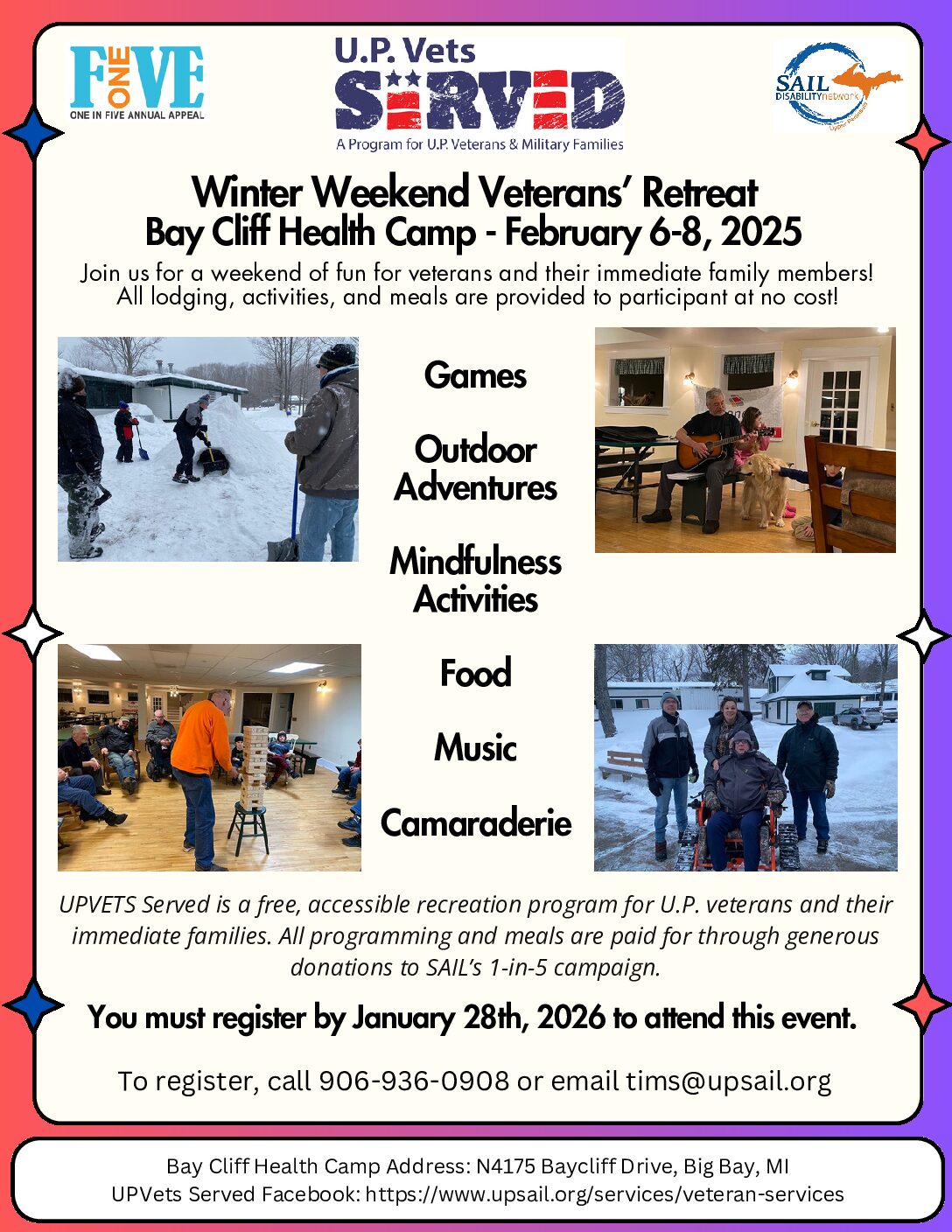 Image description begins. U.P. Vets Served Winter Weekend Veterans’ Retreat at Bay Cliff Health Camp, February 6th through February 8th, 2026. Join us for a weekend of fun for veterans and their immediate family members! All lodging, activities, and meals are provided to participants at no cost! There will be games, outdoor adventures, mindfulness activities, food, music, and camaraderie. You must register by January 28th, 2026, to attend this event. To register, call 906-936-0908 or email tims@upsail.org. The address for Bay Cliff Health Camp is N4175 Baycliff Drive, Big Bay, Michigan. UPVETS Served is a free, accessible recreation program for U.P. veterans and their immediate families. All programming and meals are paid for through generous donations to SAIL’s 1-in-5 campaign. Image description ends.