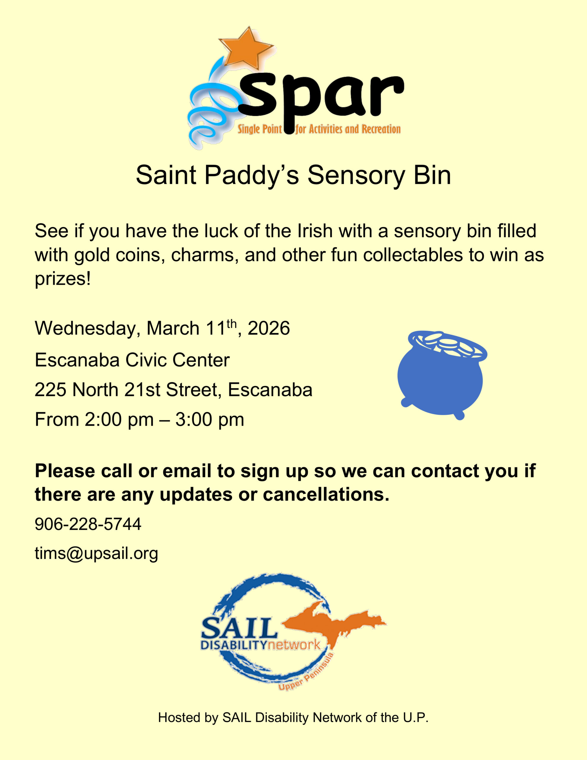 Image description begins. The text on the flyer reads. St. Paddy’s Sensory Bin. See if you have the luck of the Irish with a sensory bin filled with gold coins, charms, and other fun collectables to win as prizes on Wednesday, March 11th, 2026, at the Escanaba Civic Center, located at 225 North 21st Street in Escanaba, from 2:00 pm to 3:00 pm. Please call 906-228-5744 or email tims@upsail.org to sign up so we can contact you if there are any updates or cancellations. Hosted by SAIL Disability Network of the U.P. Image description ends.
