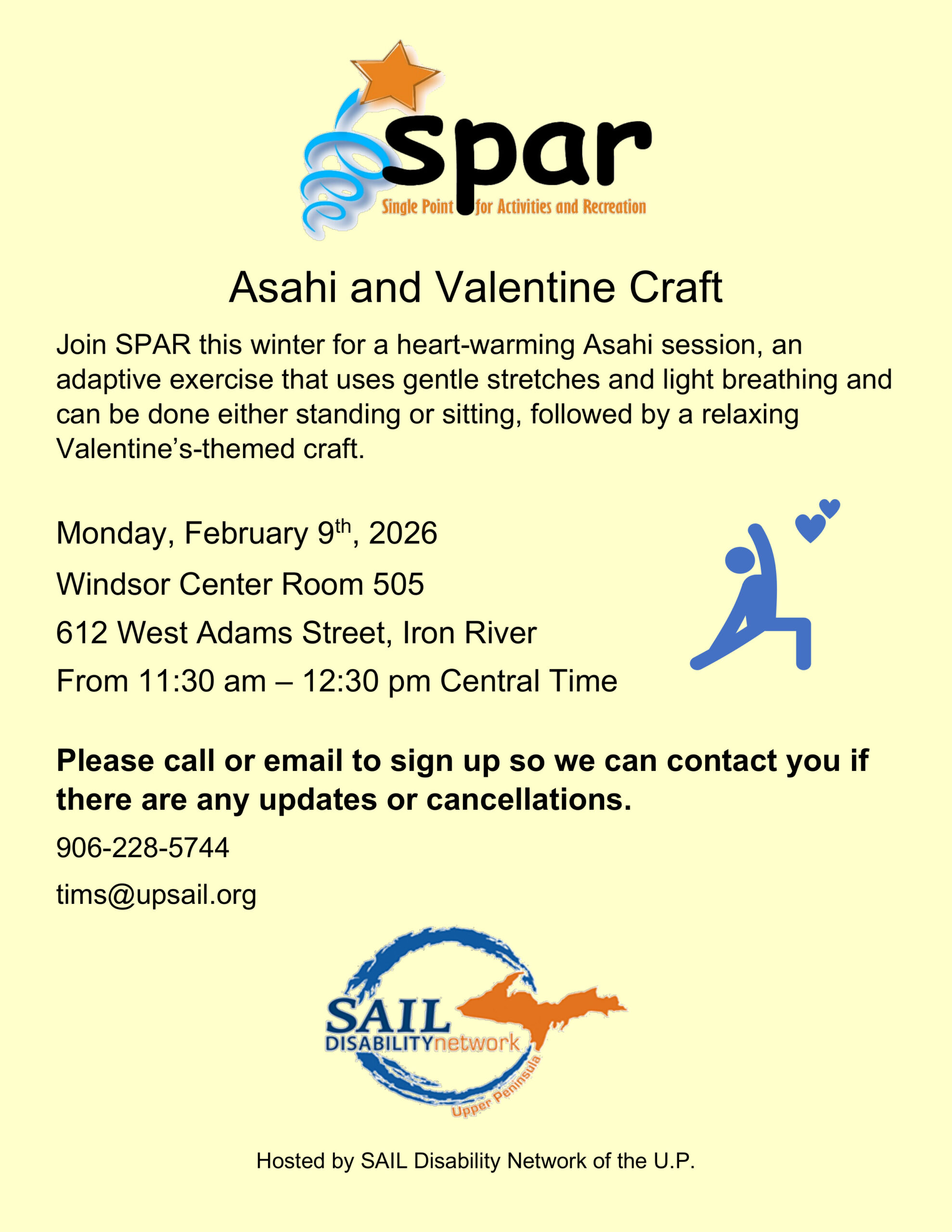 Image description begins. The text on the flyer reads. Asahi and Valentine Craft. Join SPAR this winter for a heart-warming Asahi session, an adaptive exercise that uses gentle stretches and light breathing and can be done either standing or sitting, followed by a relaxing Valentine-themed craft on Monday, February 9th, 2026, at the Windsor Center Room 505, located at 612 West Adams Street, in Iron River, from 11:30 am to 12:30 pm Central Time. Please call 906-228-5744 or email tims@upsail.org to sign up so we can contact you if there are any updates or cancellations. Hosted by SAIL Disability Network of the U.P. Image description ends.