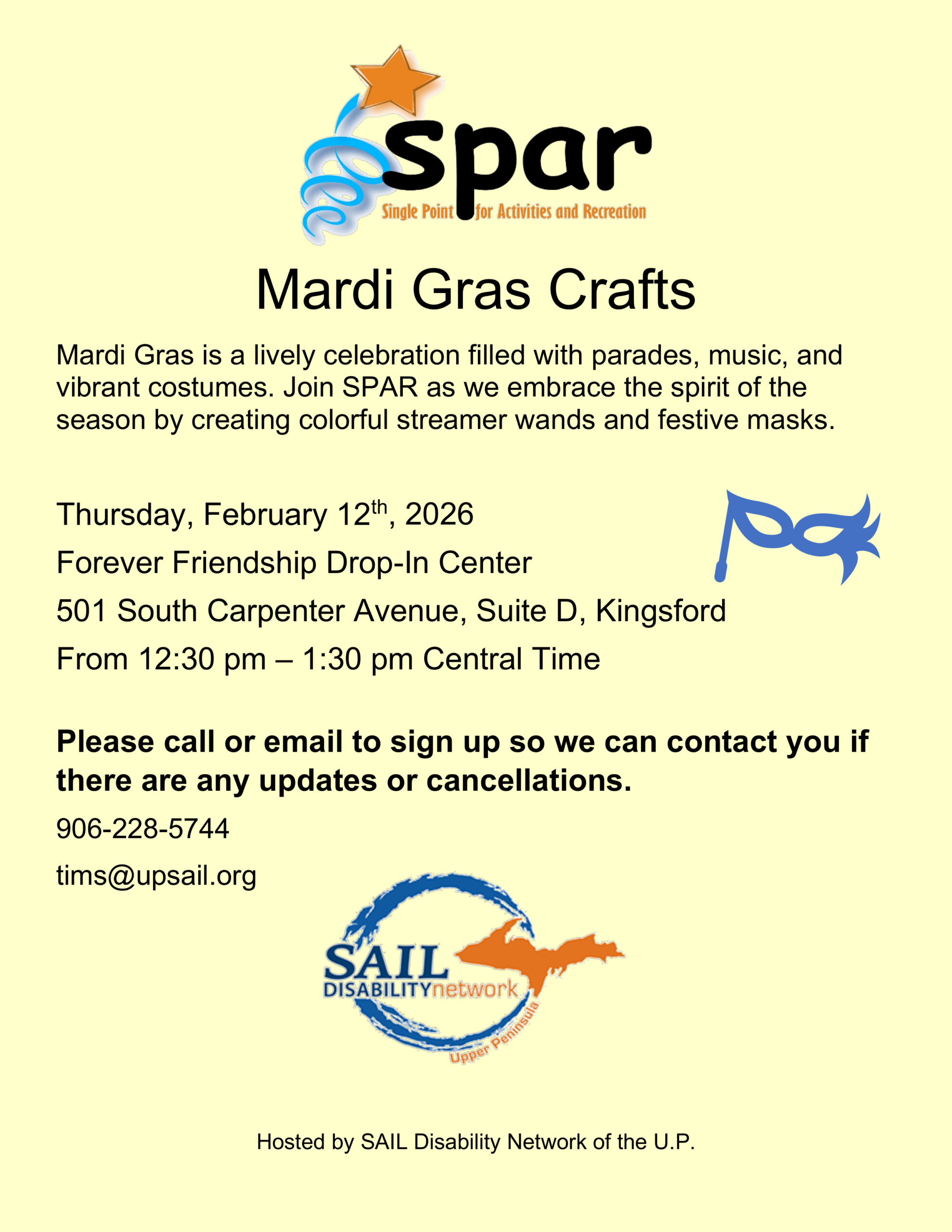 Image description begins. The text on the flyer reads. Mardi Gras Crafts. Mardi Gras is a lively celebration filled with parades, music, and vibrant costumes. Join SPAR as we embrace the spirit of the season by creating colorful streamer wands and festive masks on Thursday, February 12th, 2026, at the Forever Friendship Drop-In Center, located at 501 South Carpenter Avenue, Suite D, in Kingsford, from 12:30 pm to 1:30 pm Central Time. Please call 906-228-5744 or email tims@upsail.org to sign up so we can contact you if there are any updates or cancellations. Hosted by SAIL Disability Network of the U.P. Image description ends.