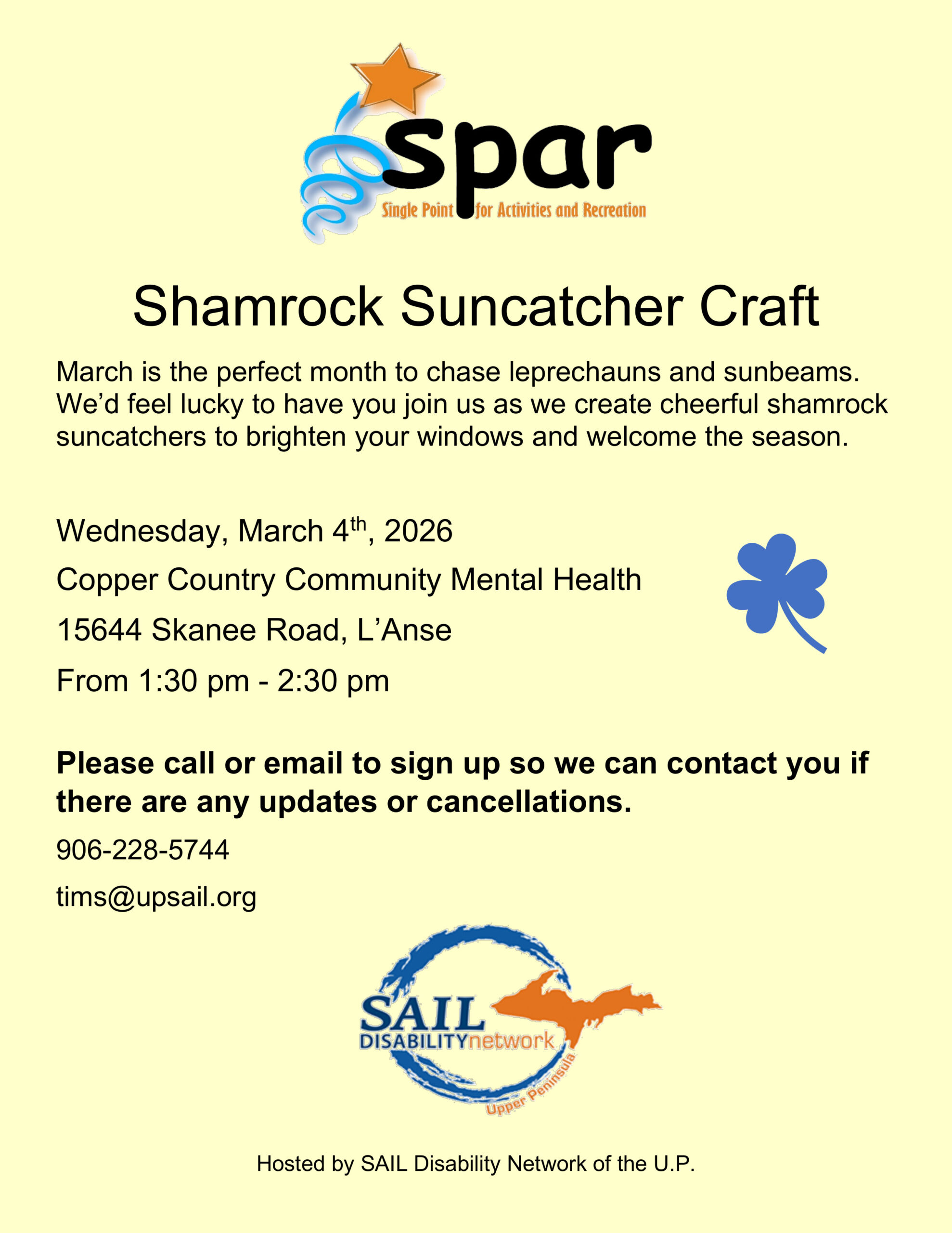 Image description begins. The text on the flyer reads. Shamrock Suncatcher Craft. March is the perfect month to chase leprechauns and sunbeams. We’d feel lucky to have you join us as we create cheerful shamrock suncatchers to brighten your windows and welcome the season on Wednesday, March 4th, 2026, at Copper Country Community Mental Health, located at 15644 Skanee Road, in L’Anse, from 1:30 pm to 2:30 pm. Please call 906-228-5744 or email tims@upsail.org to sign up so we can contact you if there are any updates or cancellations. Hosted by SAIL Disability Network of the U.P. Image description ends. Hosted by SAIL Disability Network of the U.P. Image description ends.