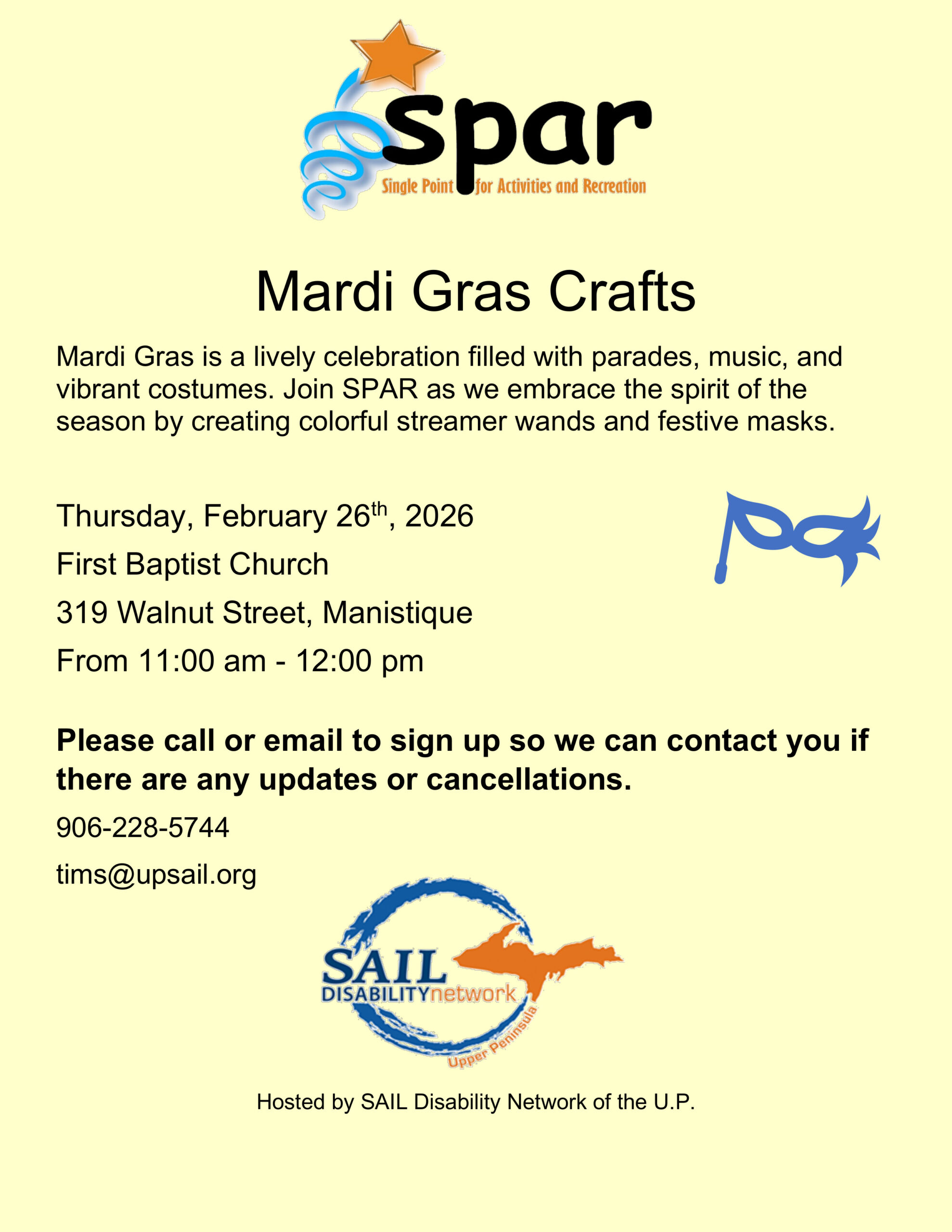 Image description begins. The text on the flyer reads. Mardi Gras Crafts. Mardi Gras is a lively celebration filled with parades, music, and vibrant costumes. Join SPAR as we embrace the spirit of the season by creating colorful streamer wands and festive masks on Thursday, February 26th, 2026, at First Baptist Church, located at 319 Walnut Street, in Manistique, from 11:00 am to 12:00 pm. Please call 906-228-5744 or email tims@upsail.org to sign up so we can contact you if there are any updates or cancellations. Hosted by SAIL Disability Network of the U.P. Image description ends.