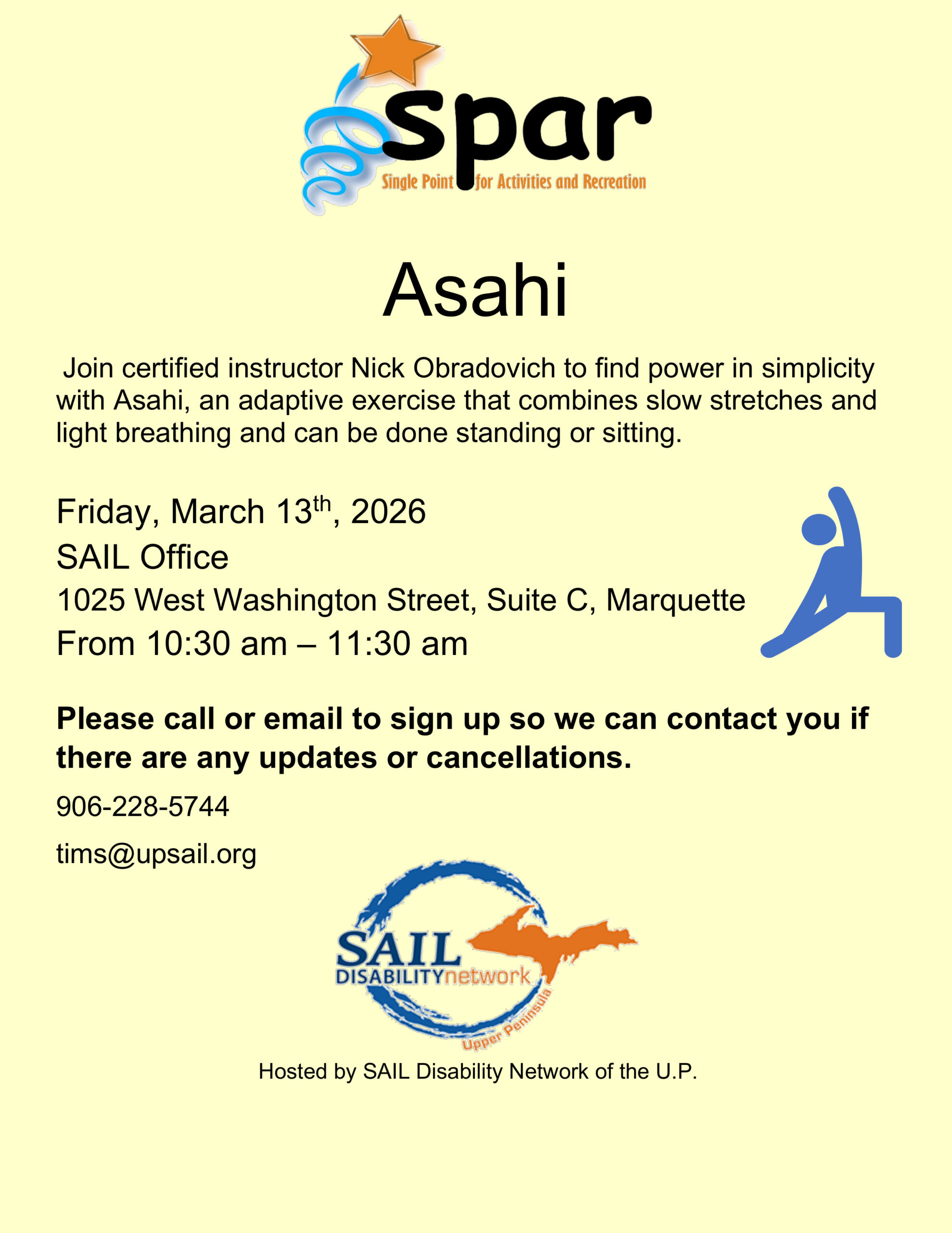Image description begins. The text on the flyer reads. Asahi. Join certified instructor Nick Obradovich to find power in simplicity with Asahi, an adaptive exercise that combines slow stretches and light breathing and can be done standing or sitting at the SAIL Office, located at 1025 West Washington Street, Suite C, in Marquette, from 10:30 am to 11:30 am on Friday, March 13th, 2026. Please call 906-228-5744 or email tims@upsail.org to sign up so we can contact you if there are any updates or cancellations. Hosted by SAIL Disability Network of the U.P. Image description ends.