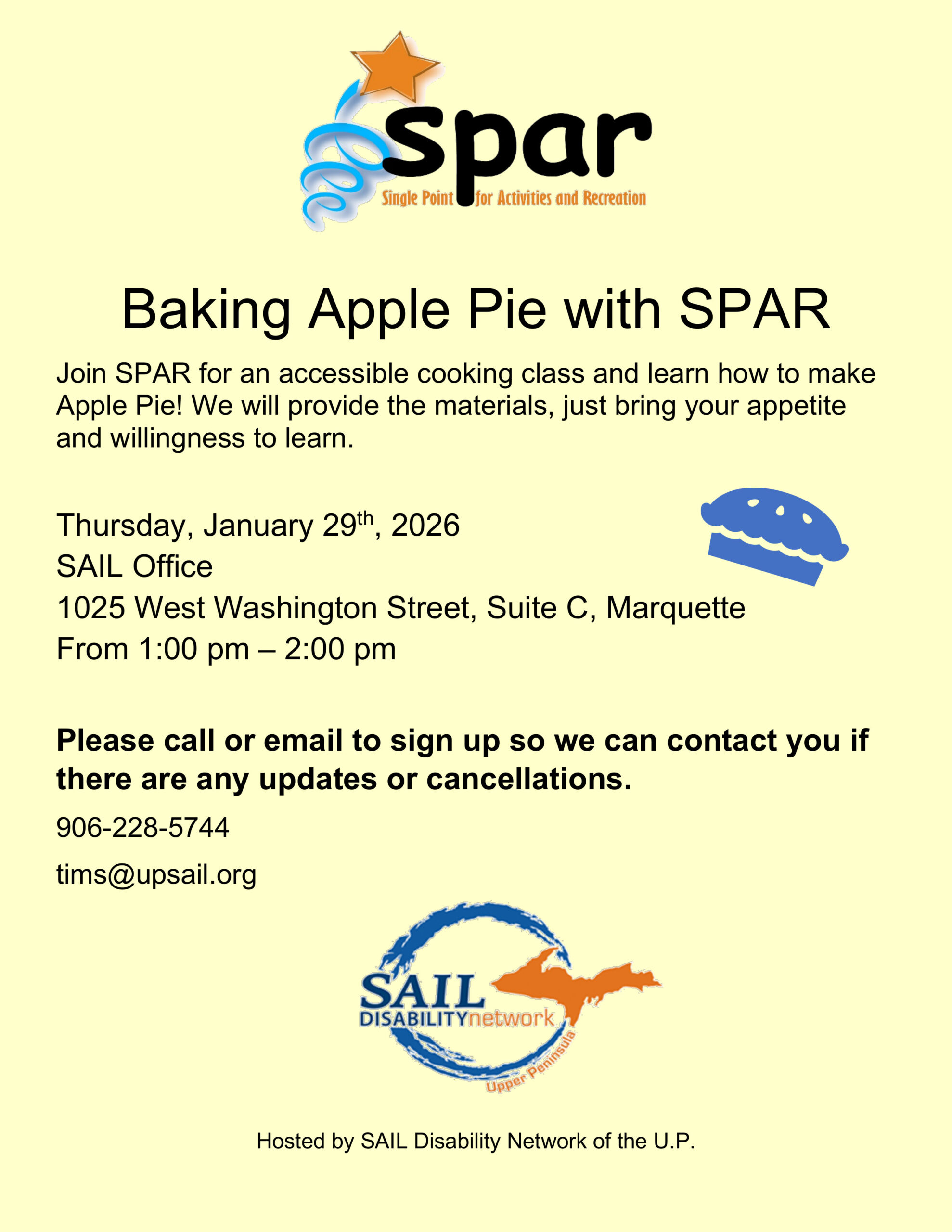 Image description begins. The text on the flyer reads. Baking Apple Pie with SPAR. Join SPAR for an accessible cooking class and learn how to make Apple Pie! We will provide the materials, just bring your appetite and willingness to learn on Thursday, January 29th, 2026, at the SAIL Office, located at 1025 West Washington Street, Suite C in Marquette, from 1:00 pm to 2:00 pm. Please call 906-228-5744 or email tims@upsail.org to sign up so we can contact you if there are any updates or cancellations. Hosted by SAIL Disability Network of the U.P. Image description ends.