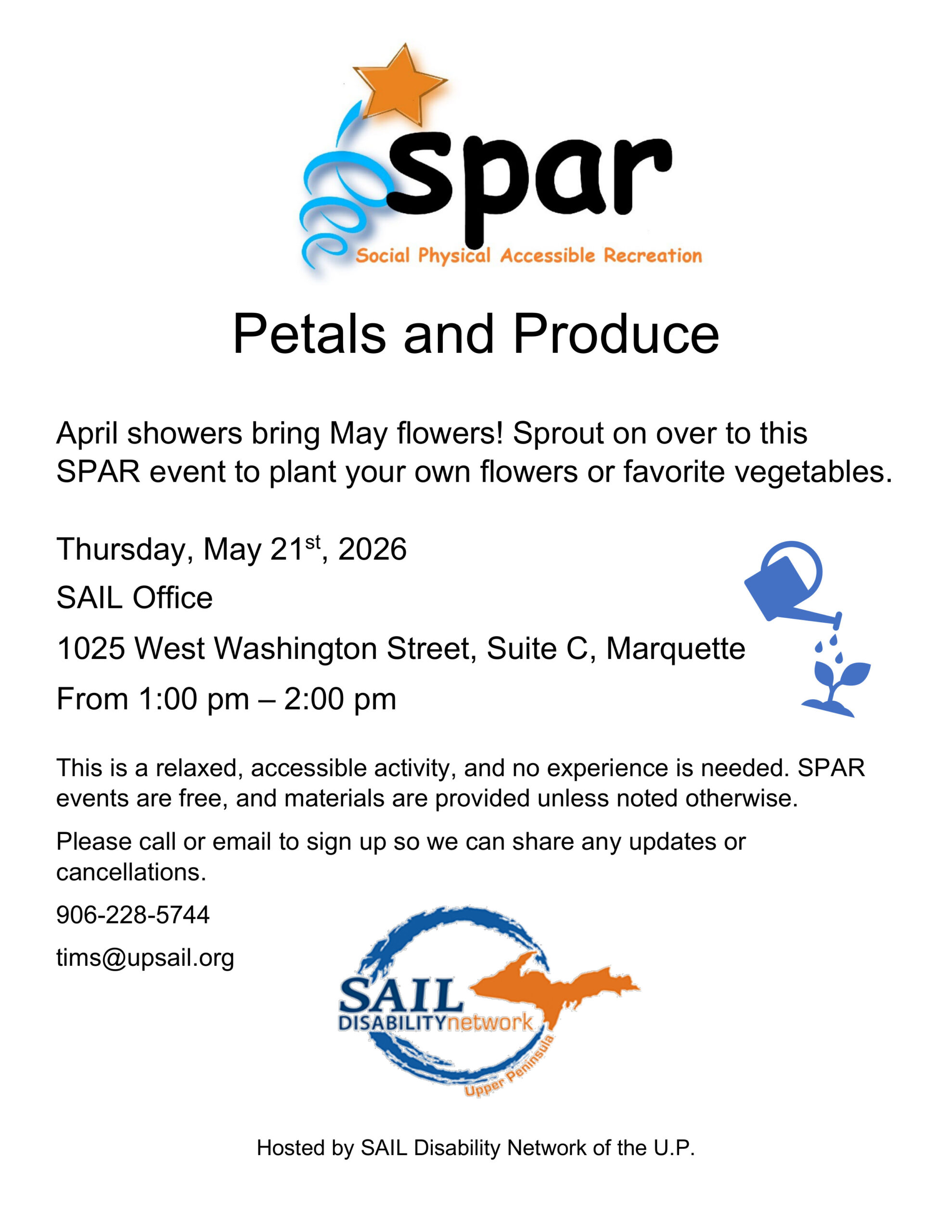 Image description begins. The text on the SPAR flyer reads. Petals and Produce. April showers bring May flowers! Sprout on over to this SPAR event to plant your own flowers or favorite vegetables on Thursday, May 21st, 2026, from 1:00 pm to 2:00 pm, at the SAIL Office, located at 1025 West Washington Street, Suite C, in Marquette. This is a relaxed, accessible activity, and no experience is needed. SPAR events are free, and materials are provided unless noted otherwise. To sign up and be notified of updates or cancellations, please call 906-228-5744 or email tims@upsail.org. Hosted by SAIL Disability Network of the U.P. Image description ends.