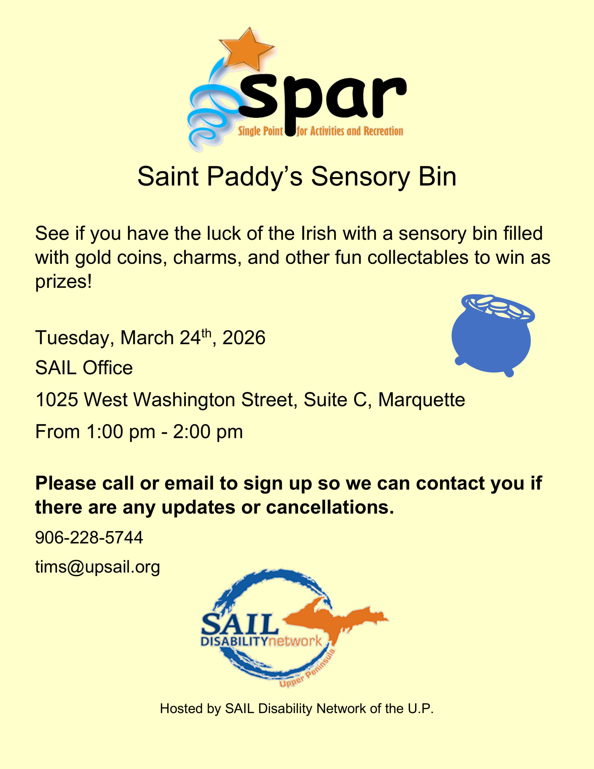Image description begins. The text on the flyer reads. St. Paddy’s Sensory Bin. See if you have the luck of the Irish with a sensory bin filled with gold coins, charms, and other fun collectables to win as prizes on Tuesday, March 24th, 2026, at the SAIL Office, located at 1025 West Washington Street, Suite C, in Marquette, from 1:00 pm to 2:00 pm. Please call 906-228-5744 or email tims@upsail.org to sign up so we can contact you if there are any updates or cancellations. Hosted by SAIL Disability Network of the U.P. Image description ends.