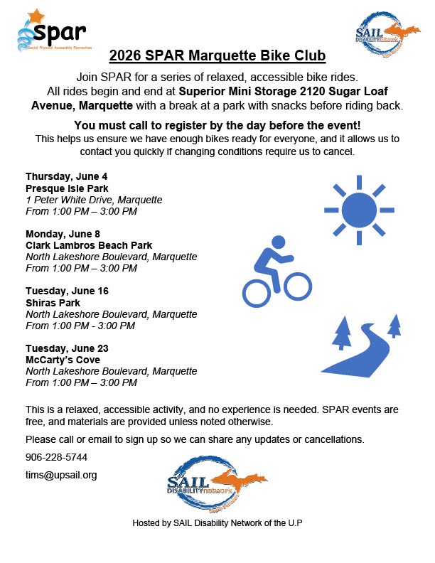 Image description begins. The text on the flyer reads. 2026 SPAR Marquette Bike Club. Join SPAR for a relaxed, accessible bike ride on Thursday, June 4, 2026, from 1:00 pm to 3:00 pm. The ride begins and ends at Superior Mini Storage, 2120 Sugar Loaf Avenue, Marquette, with a break at Presque Isle Park with snacks before riding back. You must call to register by June 3rd to help us ensure we have enough bikes ready for everyone, and it allows us to contact you quickly if changing conditions require us to cancel. This is a relaxed, accessible activity, and no experience is needed. SPAR events are free, and materials are provided unless noted otherwise. Please call 906-228-5744 or email tims@upsail.org to sign up so we can share any updates or cancellations. Hosted by SAIL Disability Network of the U.P. Image description ends.