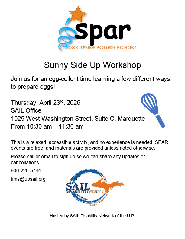 Image description begins. The text on the SPAR flyer reads. Sunny Side Up Workshop. Join us for an egg-cellent time learning a few different ways to prepare eggs on Thursday, April 23rd, 2026, from 10:30 am to 11:30 am, at the SAIL Office, located at 1025 West Washington Street, Suite C, in Marquette. This is a relaxed, accessible activity, and no experience is needed. SPAR events are free, and materials are provided unless noted otherwise. To sign up and be notified of updates or cancellations, please call 906-228-5744 or email tims@upsail.org. Hosted by SAIL Disability Network of the U.P. Image description ends.