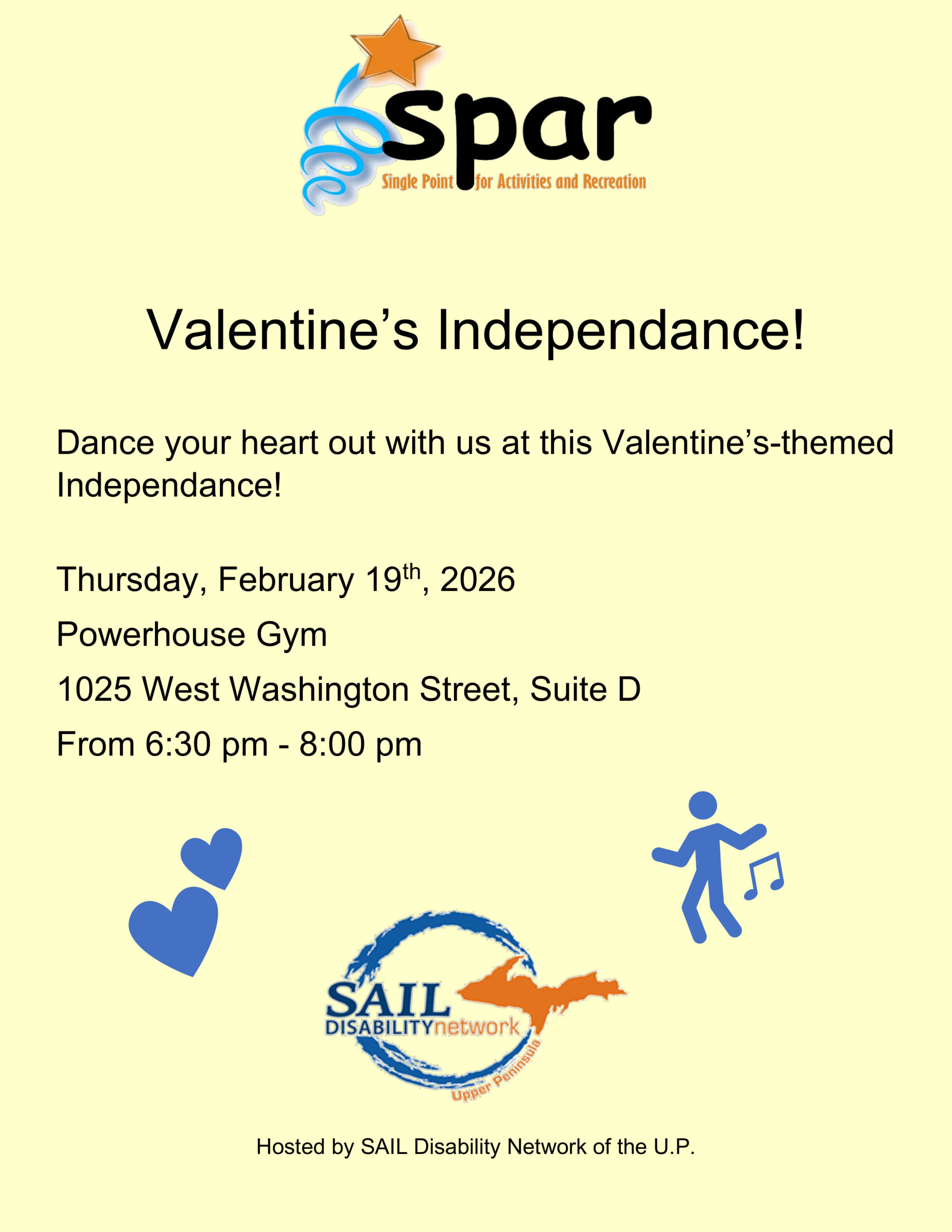 Image description begins. The text on the flyer reads. Valentine’s Independance. Dance your heart out with us at this Valentine’s-themed Independance on Thursday, February 19th, 2026, at the Powerhouse Gym, located at 1025 West Washington Street, Suite D, in Marquette, from 6:30 pm to 8:00 pm. Hosted by SAIL Disability Network of the U.P. Image description ends.