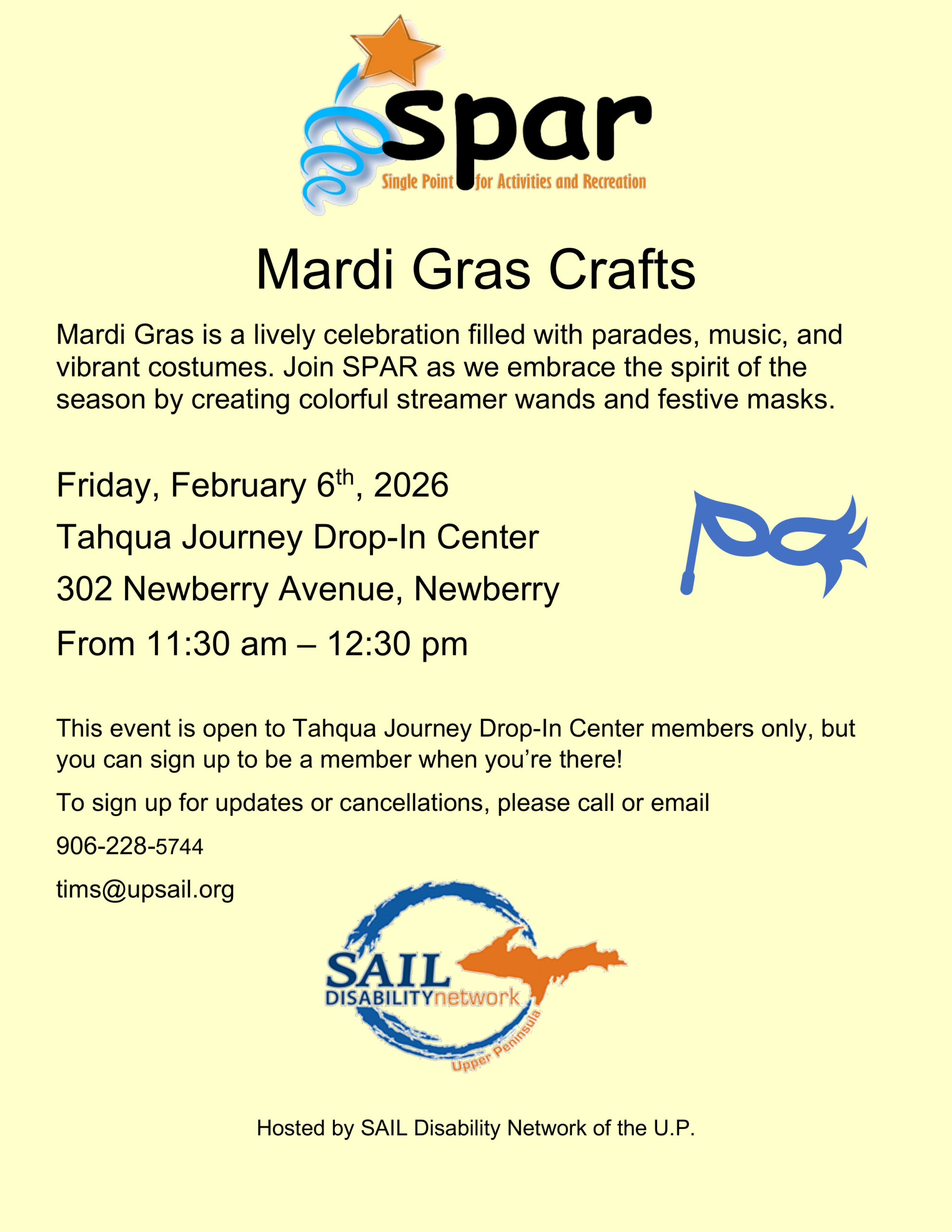 Image description begins. The text on the flyer reads. Mardi Gras Crafts. Mardi Gras is a lively celebration filled with parades, music, and vibrant costumes. Join SPAR as we embrace the spirit of the season by creating colorful streamer wands and festive masks on Friday, February 6th, 2026, at the Tahqua Journey Drop-In Center, located at 302 Newberry Avenue, in Newberry, from 11:30 am to 12:30 pm. This event is open to Tahqua Journey Drop-In Center members only, but you can sign up to be a member when you’re there! Please call 906-228-5744 or email tims@upsail.org to sign up so we can contact you if there are any updates or cancellations. Hosted by SAIL Disability Network of the U.P. Image description ends.