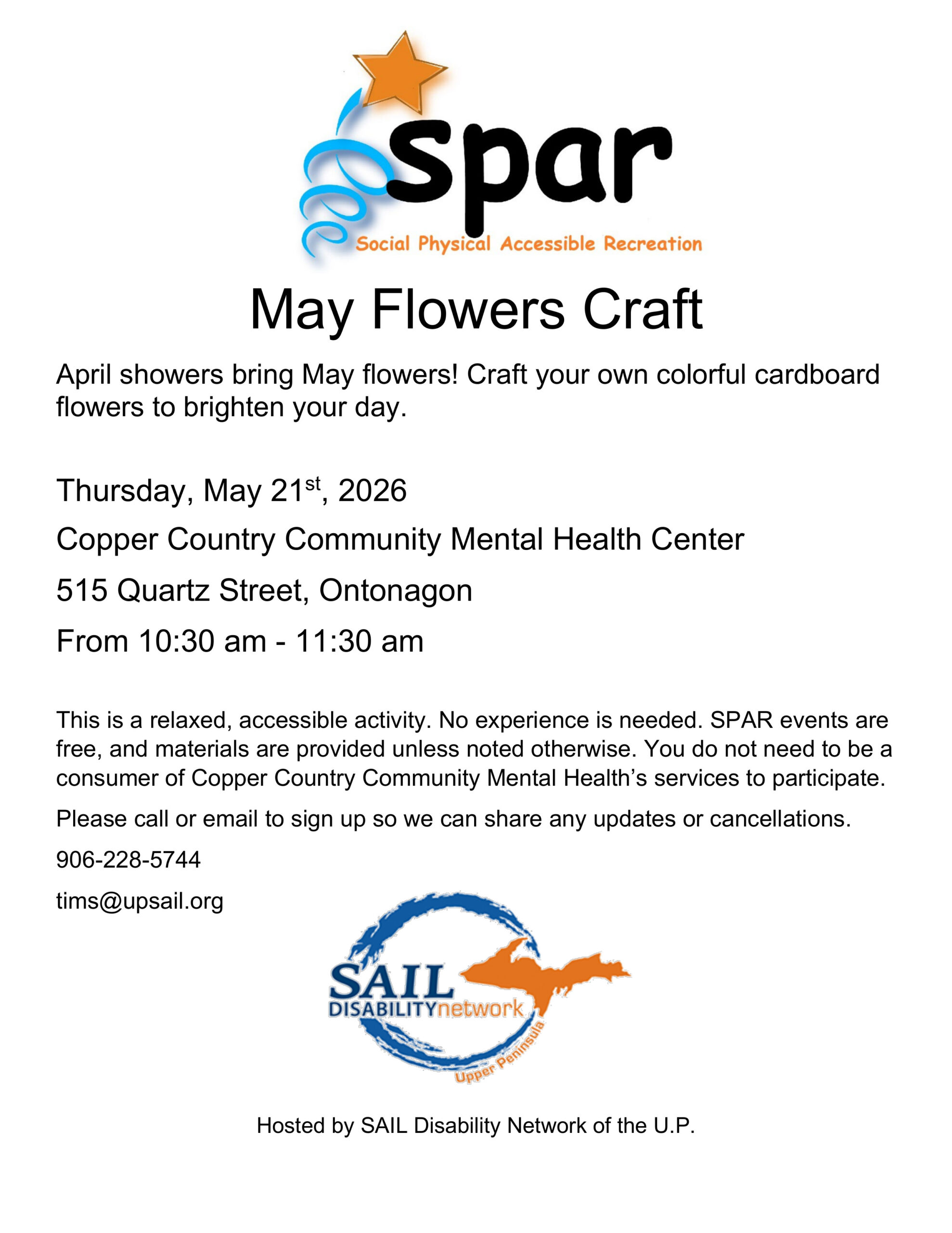 Image description begins. The text on the SPAR flyer reads. May Flowers Craft. April showers bring May flowers! Craft your own colorful cardboard flowers to brighten your day on Thursday, May 21st, 2026, from 10:30 am to 11:30 am, at Copper Country Community Mental Health Center, located at 515 Quartz Street in Ontonagon. This is a relaxed, accessible activity. No experience is needed. SPAR events are free, and materials are provided unless noted otherwise. You do not need to be a consumer of Copper Country Community Mental Health’s services to participate. To sign up and be notified of updates or cancellations, please call 906-228-5744 or email tims@upsail.org. Hosted by SAIL Disability Network of the U.P. Image description ends.