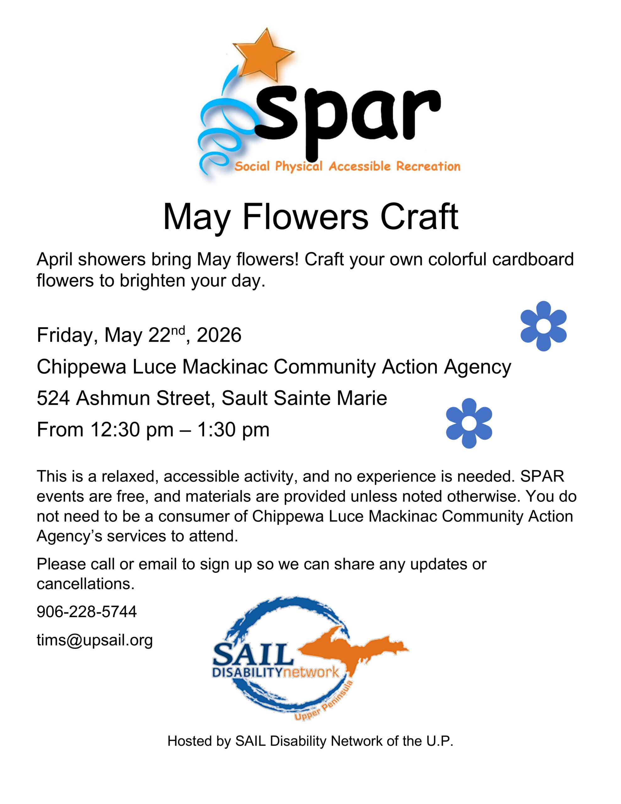 Image description begins. The text on the SPAR flyer reads. May Flowers Craft. April showers bring May flowers! Craft your own colorful cardboard flowers to brighten your day on Friday, May 22nd, 2026, from 12:30 pm to 1:30 pm, at Chippewa Luce Mackinac Community Action Agency, located at 524 Ashmun Street, in Sault Ste. Marie. This is a relaxed, accessible activity. No experience is needed. SPAR events are free, and materials are provided unless noted otherwise. You do not need to be a consumer of Chippewa Luce Mackinac Community Action Agency’s services to attend. To sign up and be notified of updates or cancellations, please call 906-228-5744 or email tims@upsail.org. Hosted by SAIL Disability Network of the U.P. Image description