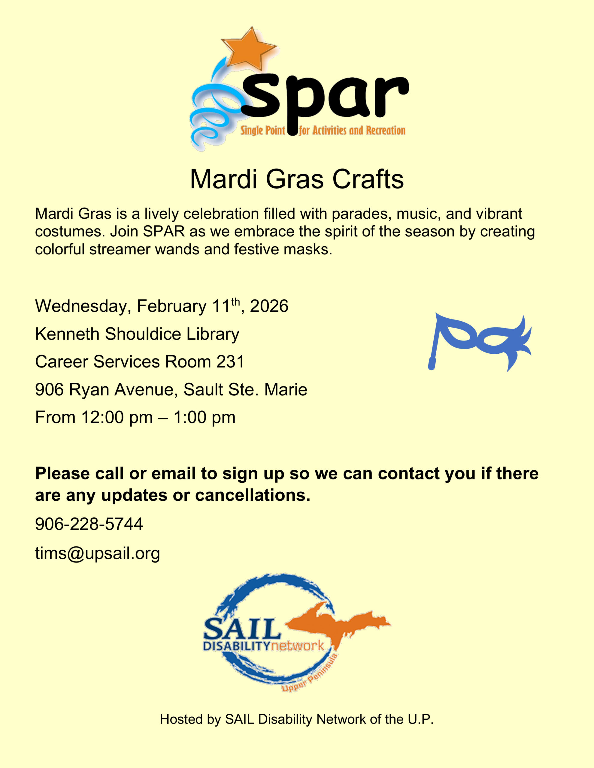 Image description begins. The text on the flyer reads. Mardi Gras Crafts. Mardi Gras is a lively celebration filled with parades, music, and vibrant costumes. Join SPAR as we embrace the spirit of the season by creating colorful streamer wands and festive masks on Wednesday, February 11th, 2026, at the Kenneth Shouldice Library, Career Services Room 231, located at 906 Ryan Avenue, in Sault Ste. Marie, from 12:00 pm to 1:00 pm. Please call 906-228-5744 or email tims@upsail.org to sign up so we can contact you if there are any updates or cancellations. Hosted by SAIL Disability Network of the U.P. Image description ends.