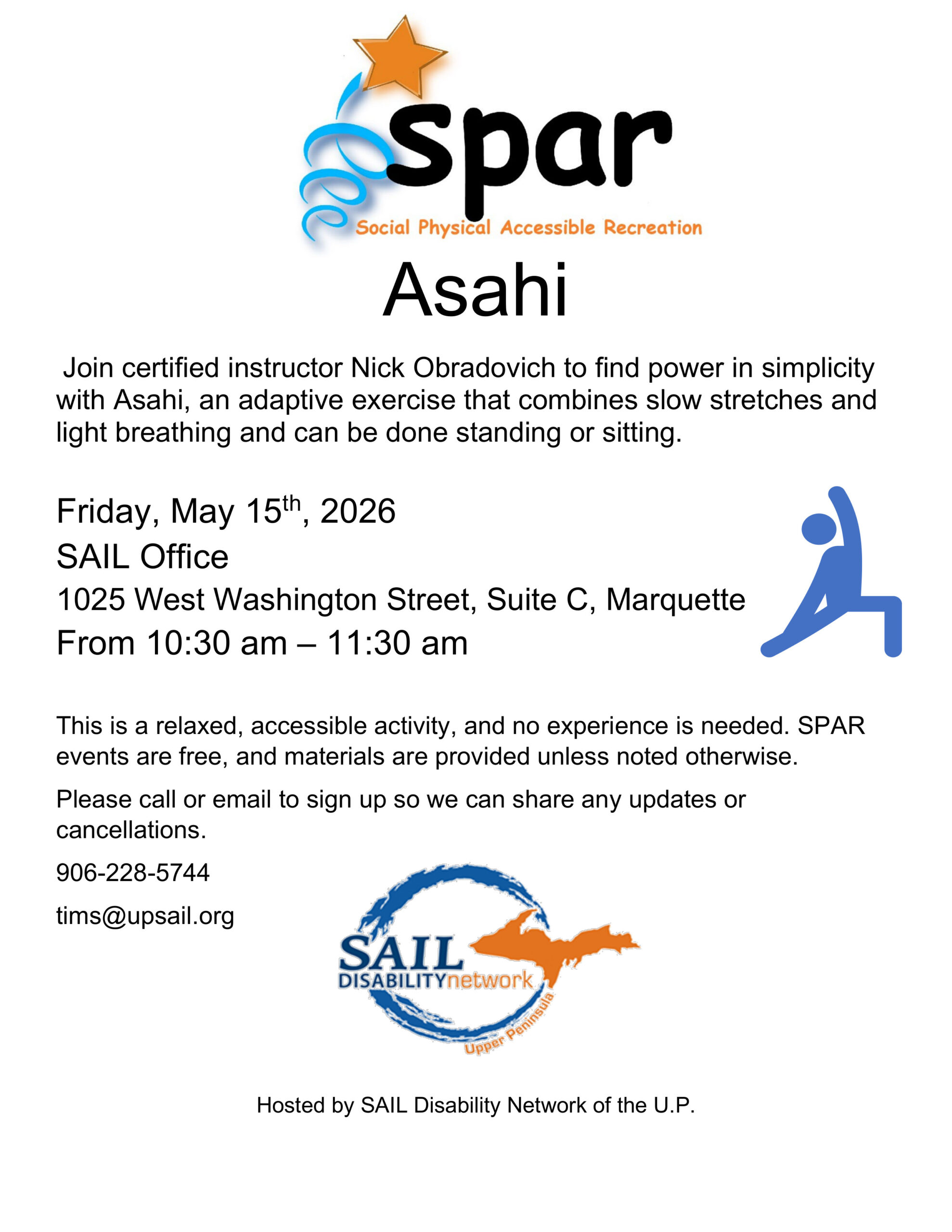 Image description begins. The text on the SPAR flyer reads. Asahi. Join certified instructor Nick Obradovich to find power in simplicity with Asahi, an adaptive exercise that combines slow stretches and light breathing, and can be done standing or sitting. This event will take place on Friday, May 15th, 2026, from 10:30 am to 11:30…