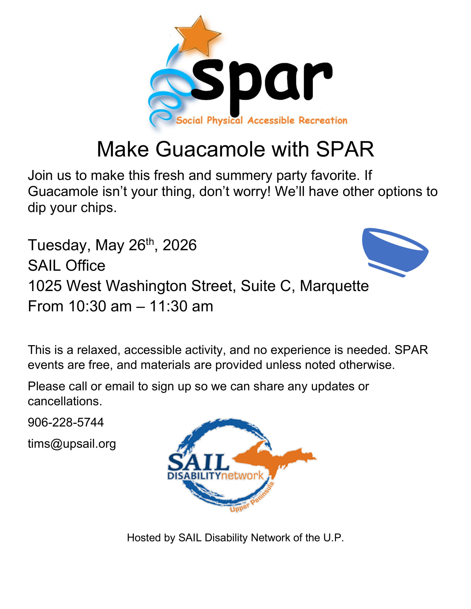 Image description begins. The text on the SPAR flyer reads. Make Guacamole with SPAR. Join us to make this fresh and summery party favorite. If Guacamole isn’t your thing, don’t worry! We’ll have other options to dip your chips on Tuesday, May 26th, 2026, from 10:30 am to 11:30 am, at the SAIL Office, located…