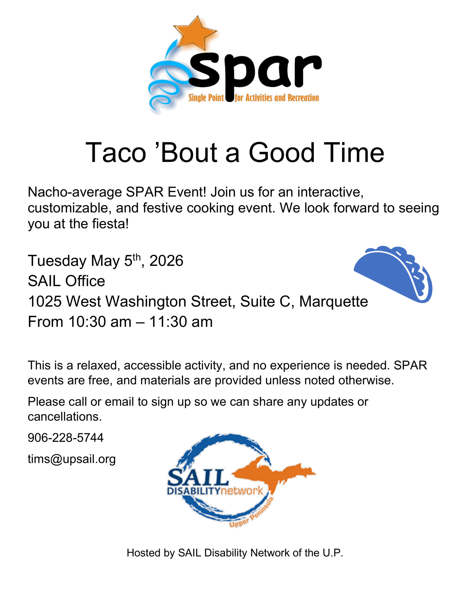 Image description begins. The text on the SPAR flyer reads. Taco ‘Bout a Good Time. Nacho-average SPAR Event! Join us for an interactive, customizable, and festive cooking event. We look forward to seeing you at the fiesta on Tuesday, May 5th, 2026, from 10:30 am to 11:30 am, at the SAIL Office, located at 1025…