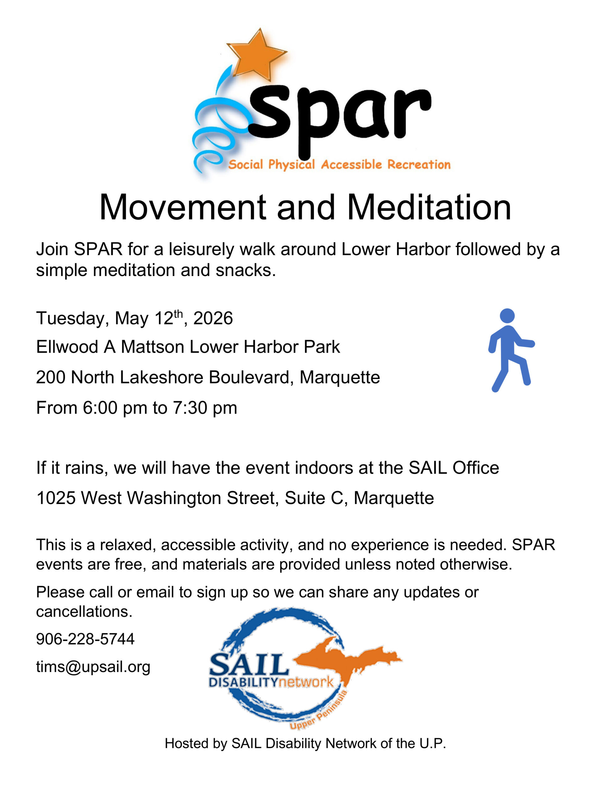 Image description begins. The text on the SPAR flyer reads. Movement and Meditation. Join SPAR for a leisurely walk around Lower Harbor followed by a simple meditation and snacks on Tuesday, May 12th, 2026, from 6:00 pm to 7:30 pm, at Ellwood A Mattson Lower Harbor Park, located at 200 North Lakeshore Boulevard in Marquette.…