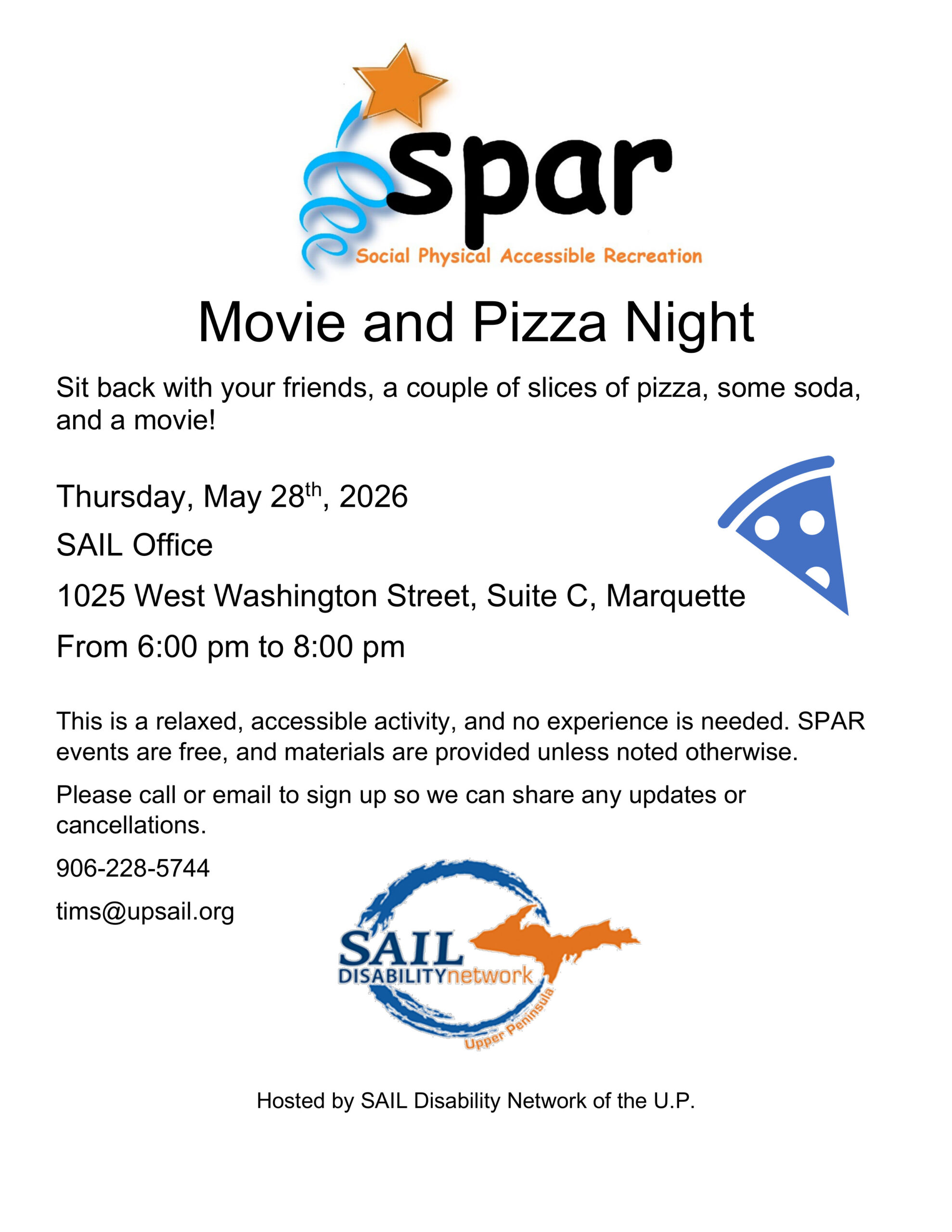 Image description begins. The text on the SPAR flyer reads. Movie and Pizza Night. Sit back with your friends, a couple of slices of pizza, some soda, and a movie on Thursday May 28th, 2026, from 6:00 pm to 8:00 pm, at the SAIL Office, located at 1025 West Washington Street, Suite C, in Marquette.…