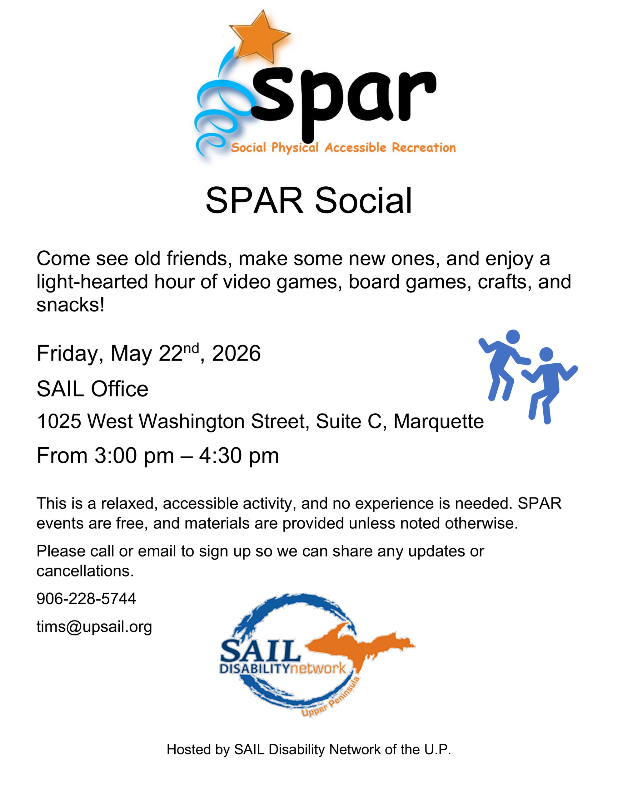 Image description begins. The text on the SPAR flyer reads. SPAR Social. Come see old friends, make some new ones, and enjoy a light-hearted hour of video games, board games, crafts, and snacks on Friday, May 22nd, 2026, from 3:00 pm to 4:30 pm, at the SAIL Office, located at 1025 West Washington Street, Suite…