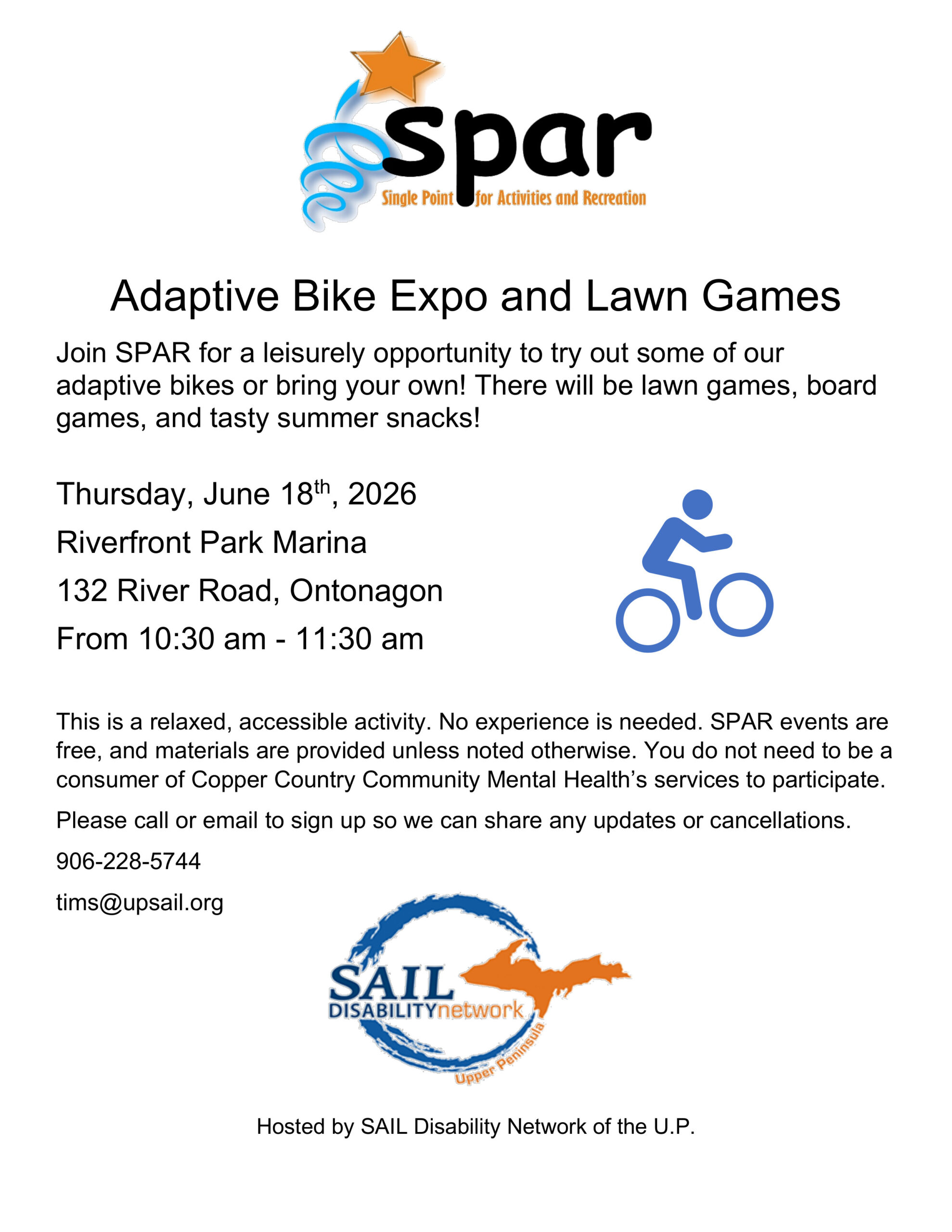 Image description begins. The text on the SPAR flyer reads. Adaptive Bike Expo and Lawn Games. Join SPAR for a leisurely opportunity to try out some of our adaptive bikes or bring your own! There will be lawn games, board games, and tasty summer snacks on Thursday, June 18th, 2026, from 10:30 am to 11:30…