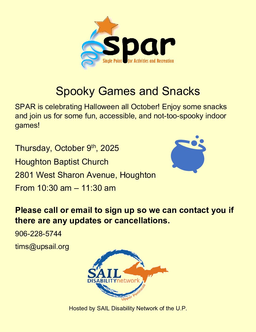 Houghton Baptist Church 2801 W Sharon Ave, Houghton, MI, United StatesImage description begins. The text on the flyer reads. Spooky Games and Snacks. SPAR is celebrating Halloween all October! Enjoy some snacks and join us for some fun, accessible, and…