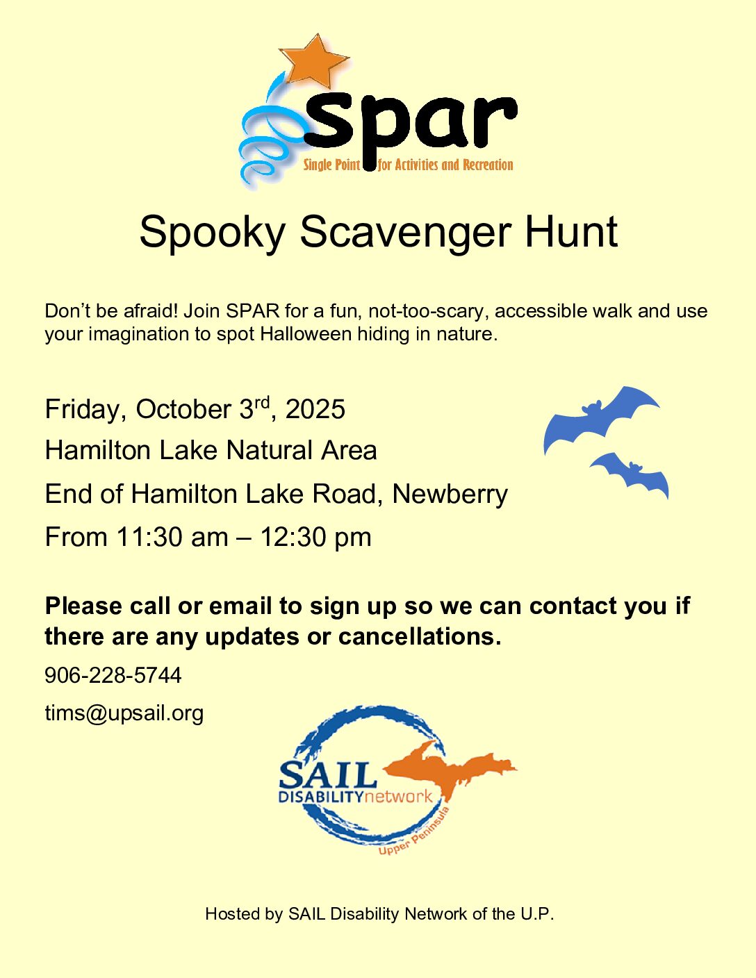 Hamilton Lake Natural Area End of Hamilton Lake Road, Newberry, MI, United StatesImage description begins. The text on the flyer reads. Spooky Scavenger Hunt. Don’t be afraid! Join SPAR for a fun, not-too-scary, accessible walk and use your imagination to spot Halloween…
