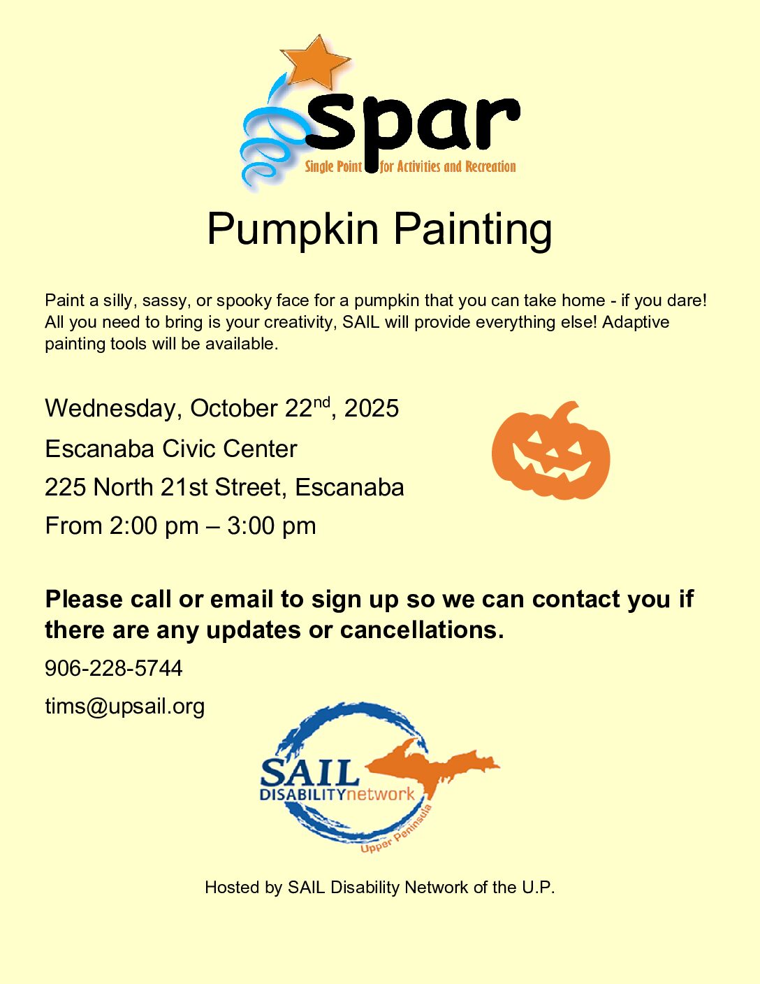 Civic Center 225 N 21st St., Escanaba, MI, United StatesImage description begins. The text on the flyer reads. Pumpkin Painting. Paint a silly, sassy, or spooky face for a pumpkin that you can take home, if you dare, at…