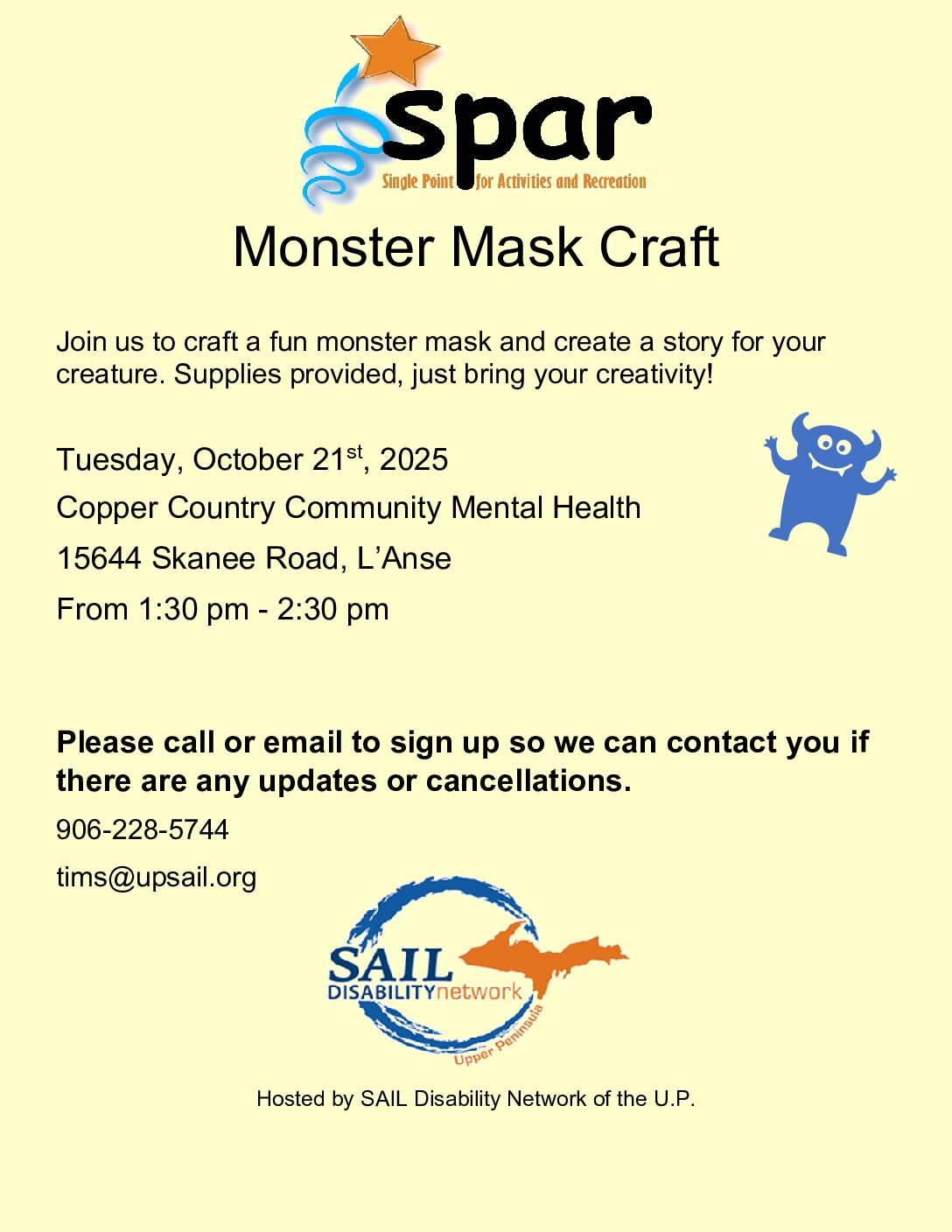 Copper Country Community Mental Health Center (L'Anse) 15644 Skanee Rd, L'Anse, MI, United StatesImage description begins. The text on the flyer reads. Monster Mask Craft. Join us to craft a fun monster mask and create a story for your creature at Copper Country…