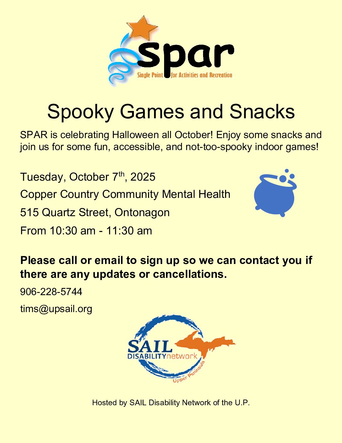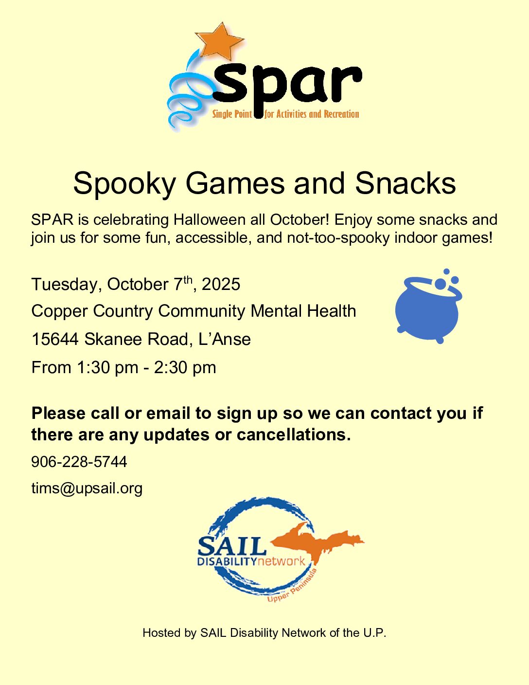 Copper Country Community Mental Health Center (L'Anse) 15644 Skanee Rd, L'Anse, MI, United StatesImage description begins. The text on the flyer reads. Spooky Games and Snacks. SPAR is celebrating Halloween all October! Enjoy some snacks and join us for some fun, accessible, and…