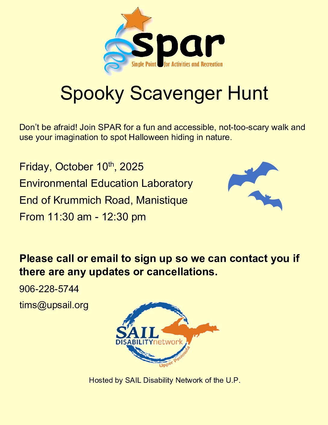 Environmental Education Laboratory Krummich Road, Manistique, MI, United StatesImage description begins. The text on the flyer reads. Spooky Scavenger Hunt. Don’t be afraid! Join SPAR for a fun and accessible, not-too-scary walk and use your imagination to spot…