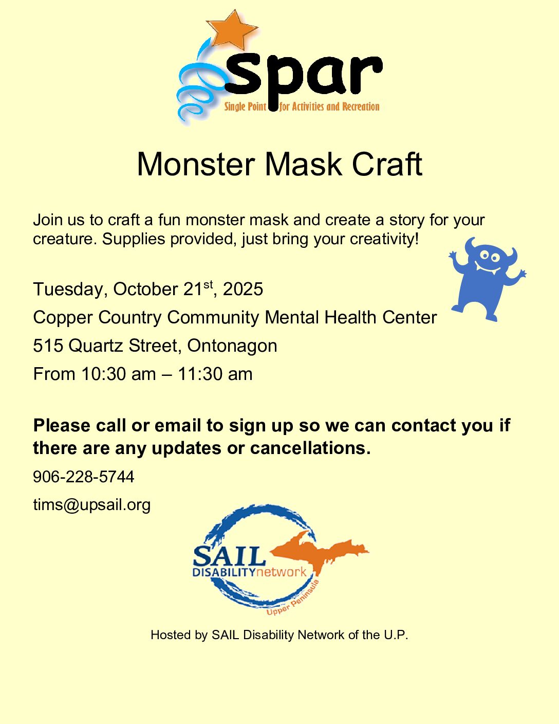 Copper Country Community Mental Health Center (Ontonagon) 515 Quartz St, Ontonagon, MI, United StatesImage description begins. The text on the flyer reads. Monster Mask Craft. Join us to craft a fun monster mask and create a story for your creature at Copper Country…