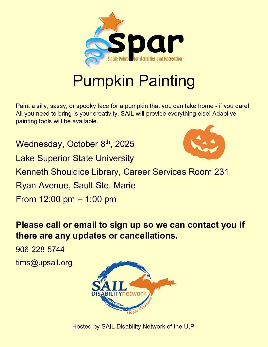 LSSU Kenneth Shouldice Library - Career Services Room 231 Ryan Avenue, Sault Ste. Marie, MI, United StatesImage description begins. The text on the flyer reads. Pumpkin Painting. Paint a silly, sassy, or spooky face for a pumpkin that you can take home, if you dare, at…