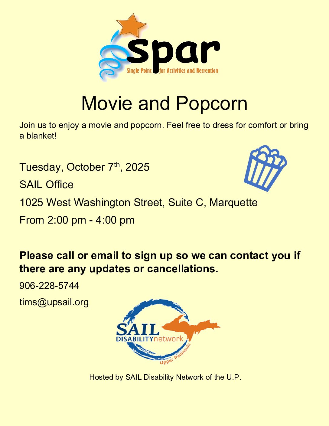 SAIL Office 1025 West Washington Street Suite C, Marquette, MI, United StatesImage description begins. The text on the flyer reads. Movie and Popcorn. Join us to enjoy a movie and popcorn at the SAIL Office, located at 1025 West Washington Street,…