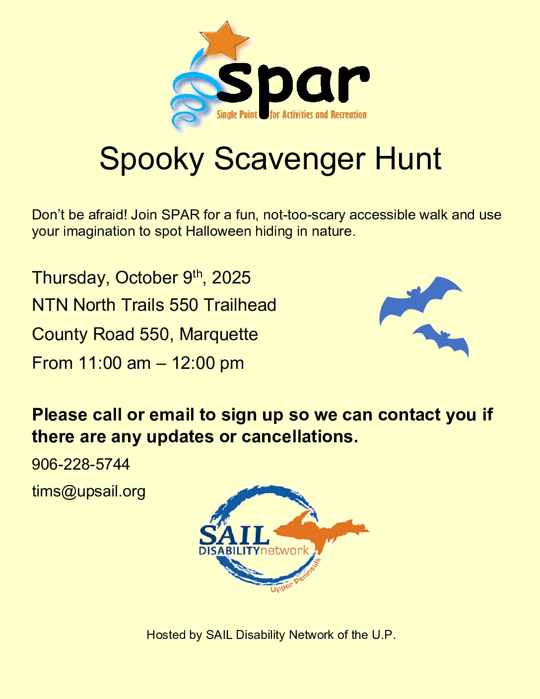 NTN North Trails 550 Trailhead Marquette, MI, United StatesImage description begins. The text on the flyer reads. Spooky Scavenger Hunt. Don’t be afraid! Join SPAR for a fun, not-too-scary, accessible walk and use your imagination to spot Halloween…