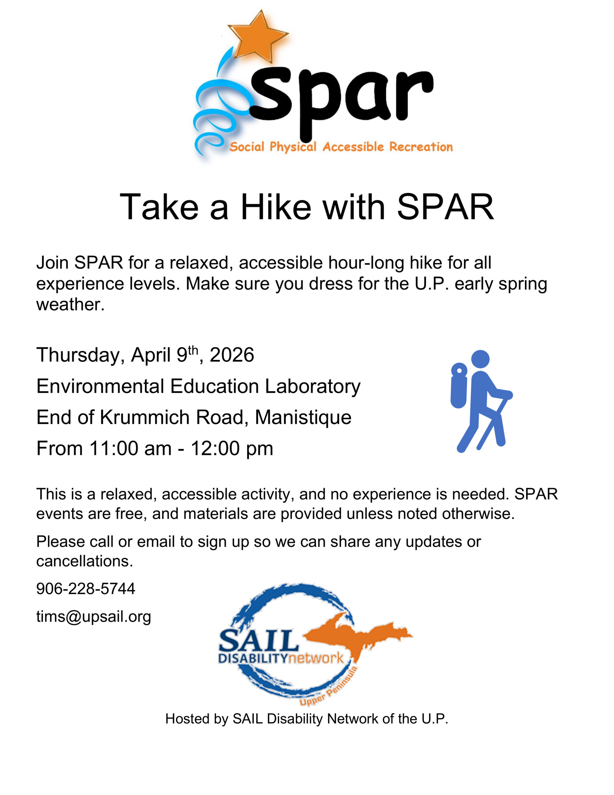 Environmental Education Laboratory Krummich Road, Manistique, MI, United StatesImage description begins. The text on the SPAR flyer reads. Take a Hike with SPAR. Join SPAR for a relaxed, accessible hour-long hike for all experience levels on Thursday, April…