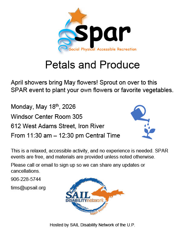 SAIL Office 1025 West Washington Street Suite C, Marquette, MI, United StatesImage description begins. The text on the SPAR flyer reads. Petals and Produce. April showers bring May flowers! Sprout on over to this SPAR event to plant your own flowers…