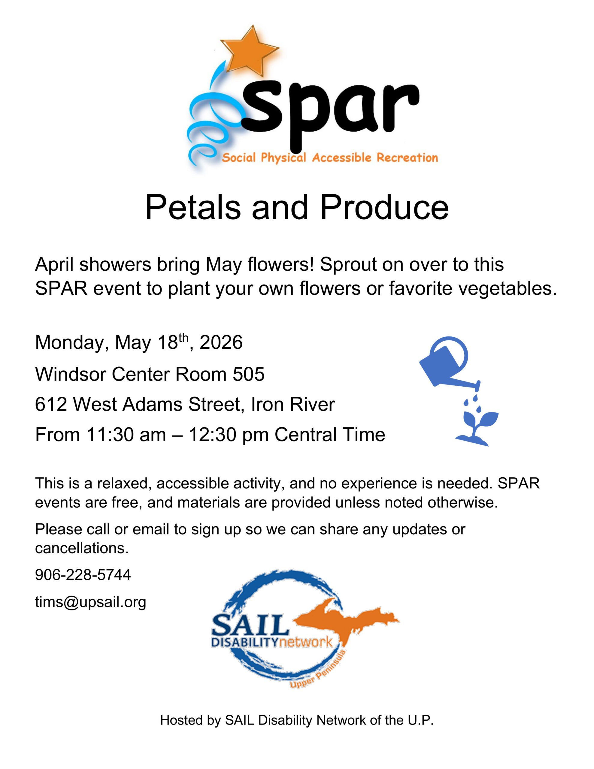 SAIL Office 1025 West Washington Street Suite C, Marquette, MI, United StatesImage description begins. The text on the SPAR flyer reads. Petals and Produce. April showers bring May flowers! Sprout on over to this SPAR event to plant your own flowers…