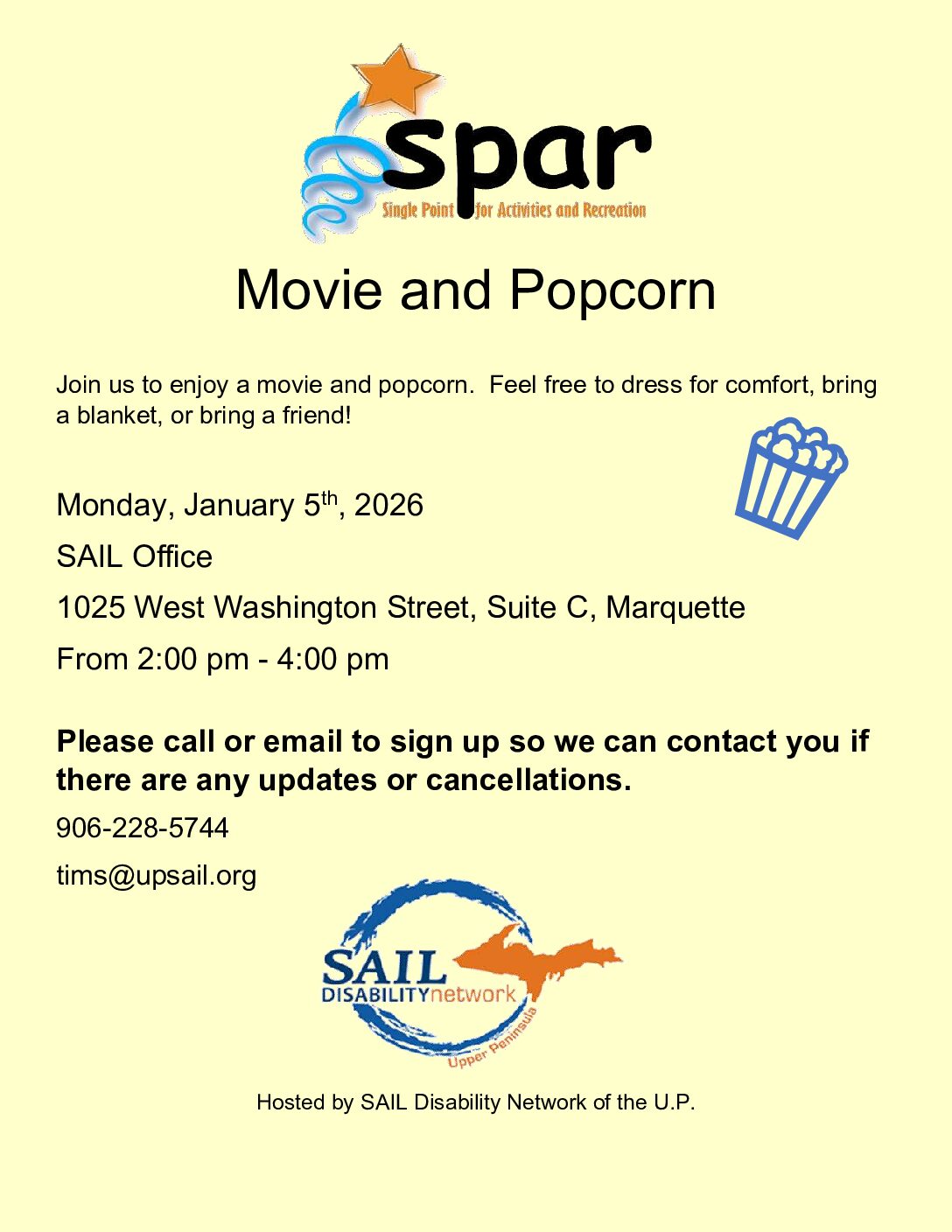 SAILImage description begins. The text on the flyer reads. Movie and Popcorn. Join us to enjoy a movie and popcorn. Feel free to dress for comfort, bring a blanket, or…