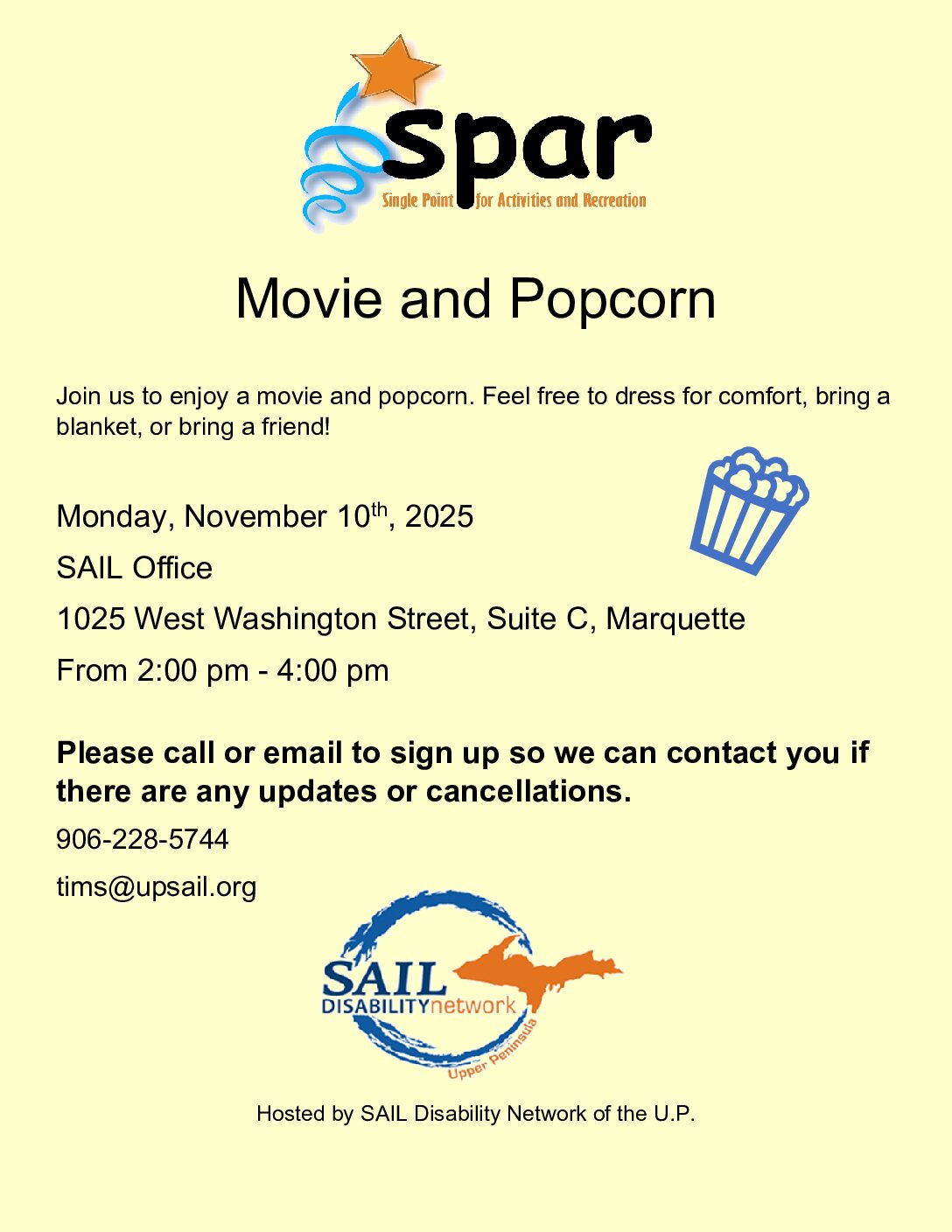 SAIL Office 1025 West Washington Street Suite C, Marquette, MI, United StatesImage description begins. The text on the flyer reads. Movie and Popcorn. Join us to enjoy a movie and popcorn at the SAIL Office, located at 1025 West Washington Street,…