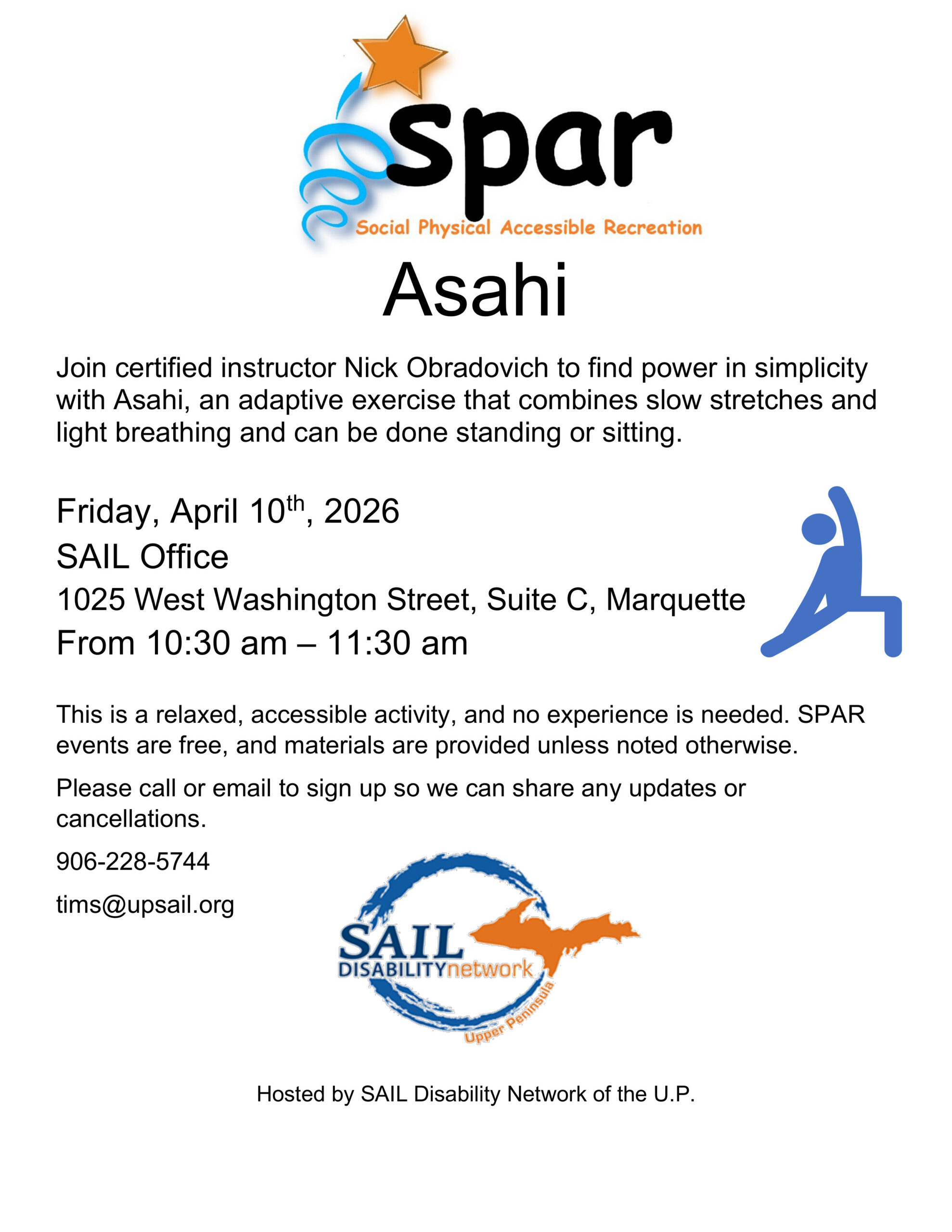 SAIL Office 1025 West Washington Street Suite C, Marquette, MI, United StatesImage description begins. The text on the SPAR flyer reads. Asahi. Join certified instructor Nick Obradovich to find power in simplicity with Asahi, an adaptive exercise that combines slow stretches…