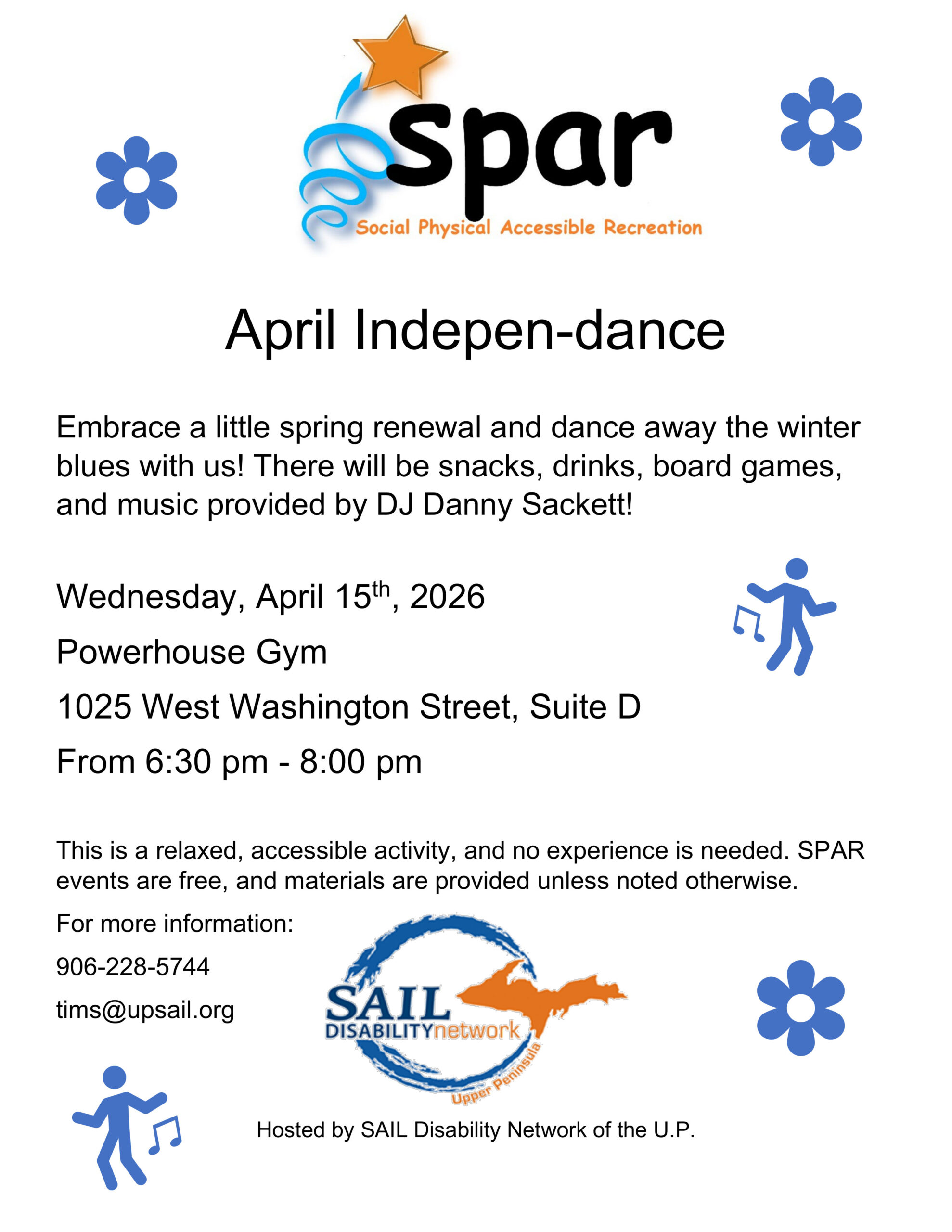 Powerhouse Gym 1025 W Washington St. Suite D, Marquette, MI, United StatesImage description begins. The text on the SPAR flyer reads. April Indepen-dance. Embrace a little spring renewal and dance away the winter blues with us on Wednesday, April 15th, 2026,…